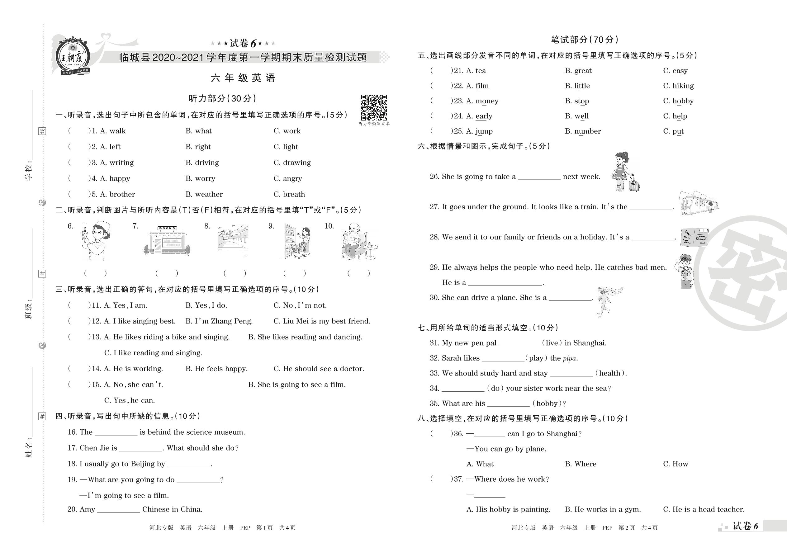 临城县2020~2021学年度第一学期期末质量检测试题六年级英语(人教PEP版)【6】