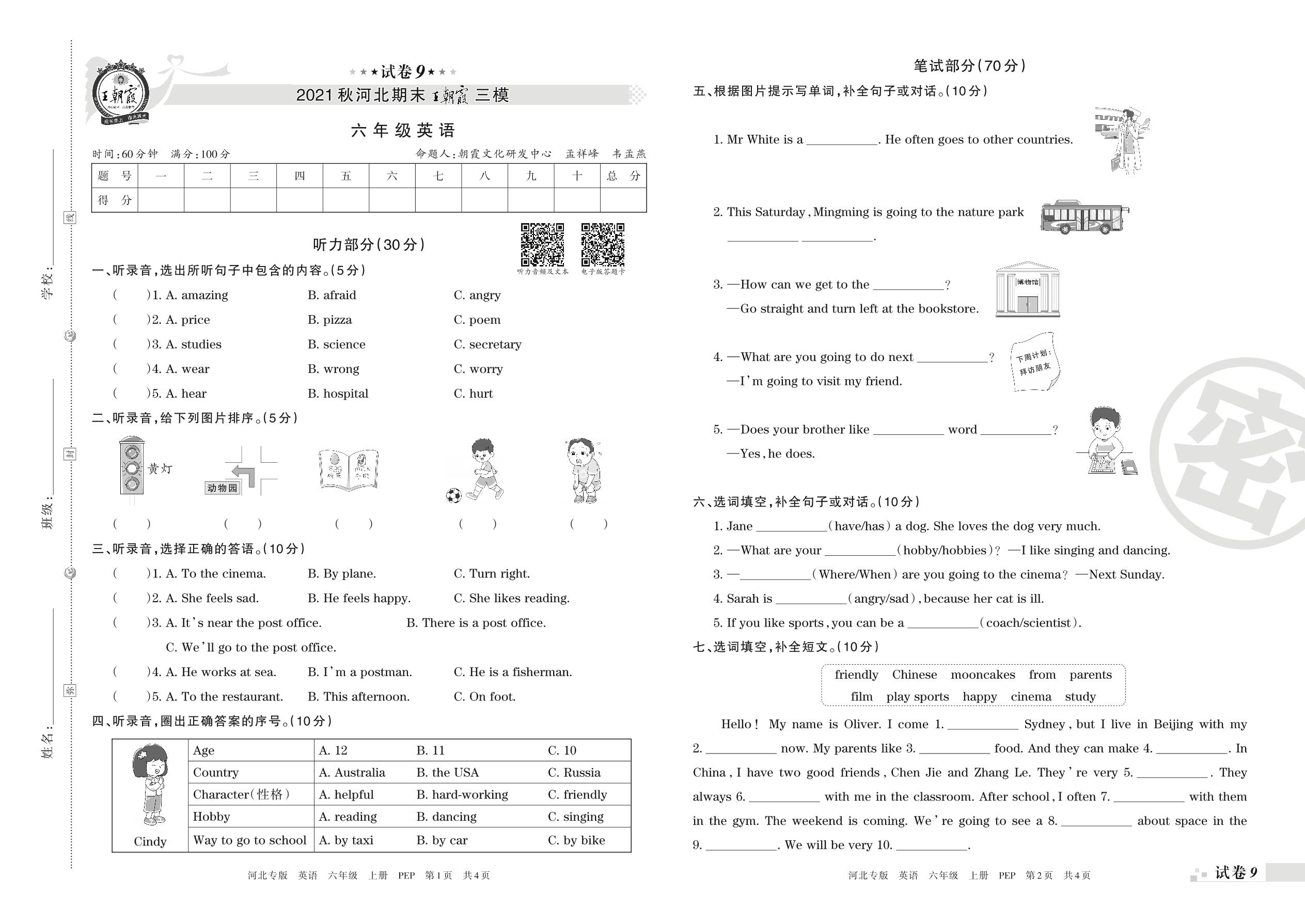王朝霞期末模拟卷六年级上册英语(人教PEP版)_R211222152201437【9】