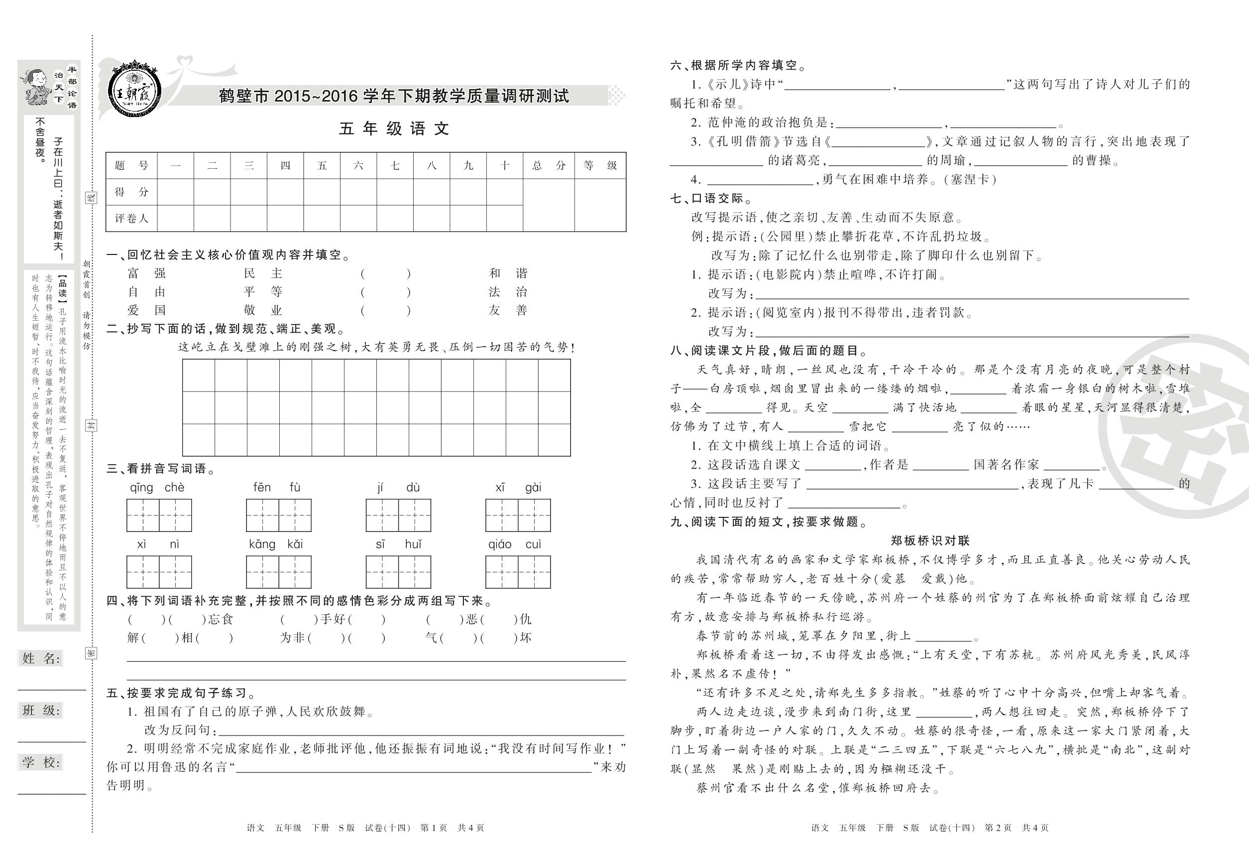 2015-2016学年第二学期鹤壁市五年级语文试卷(S版)【14】