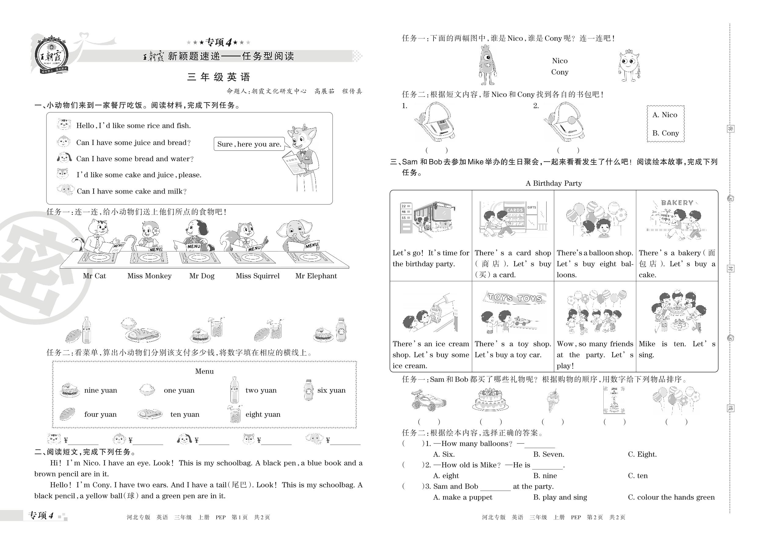 王朝霞期末专项卷——新颖题速递:任务型阅读三年级上册英语(人教PEP版)_R211222152710052【4】