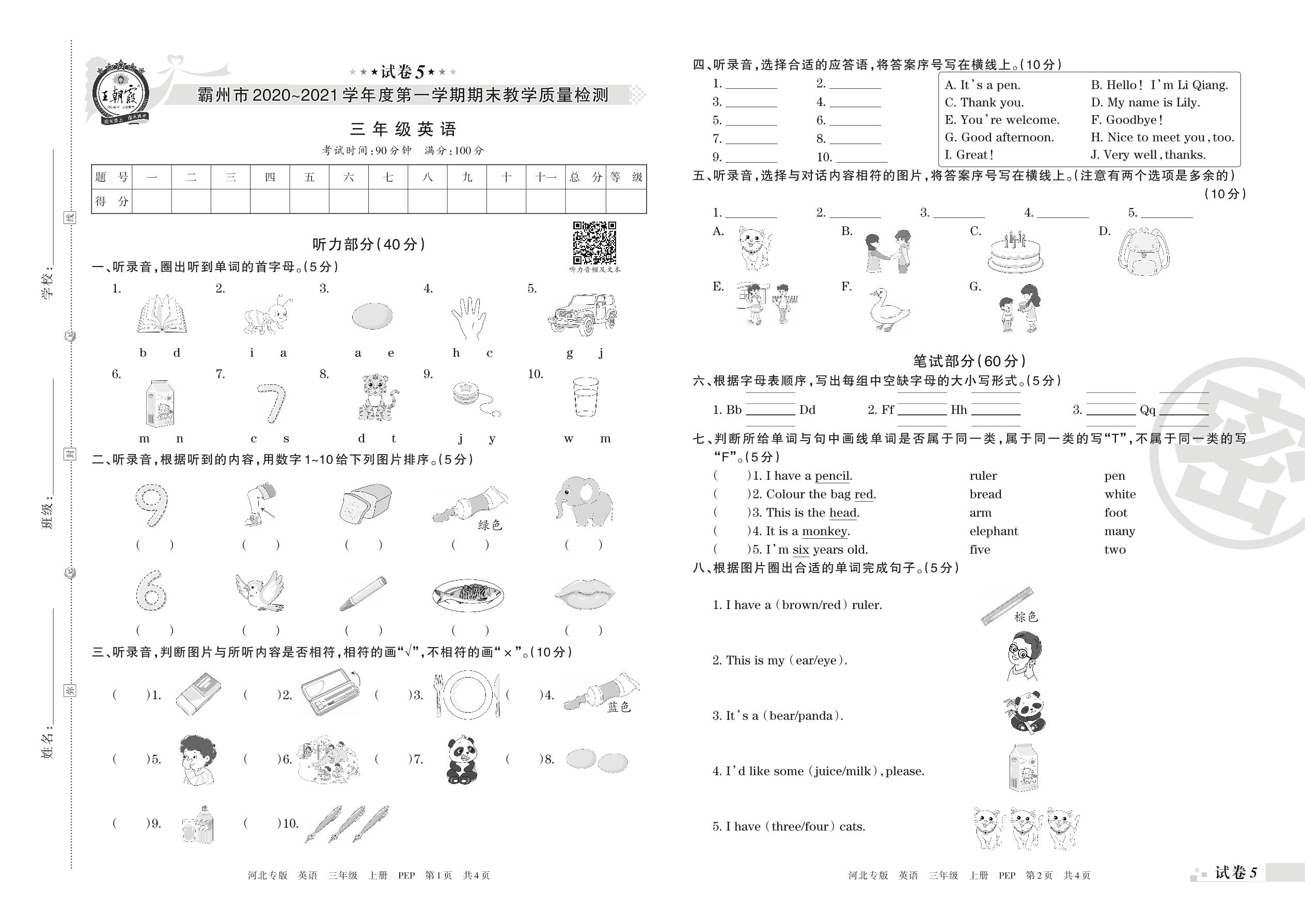 三年级英语人教PEP版(三起始)上册期末卷