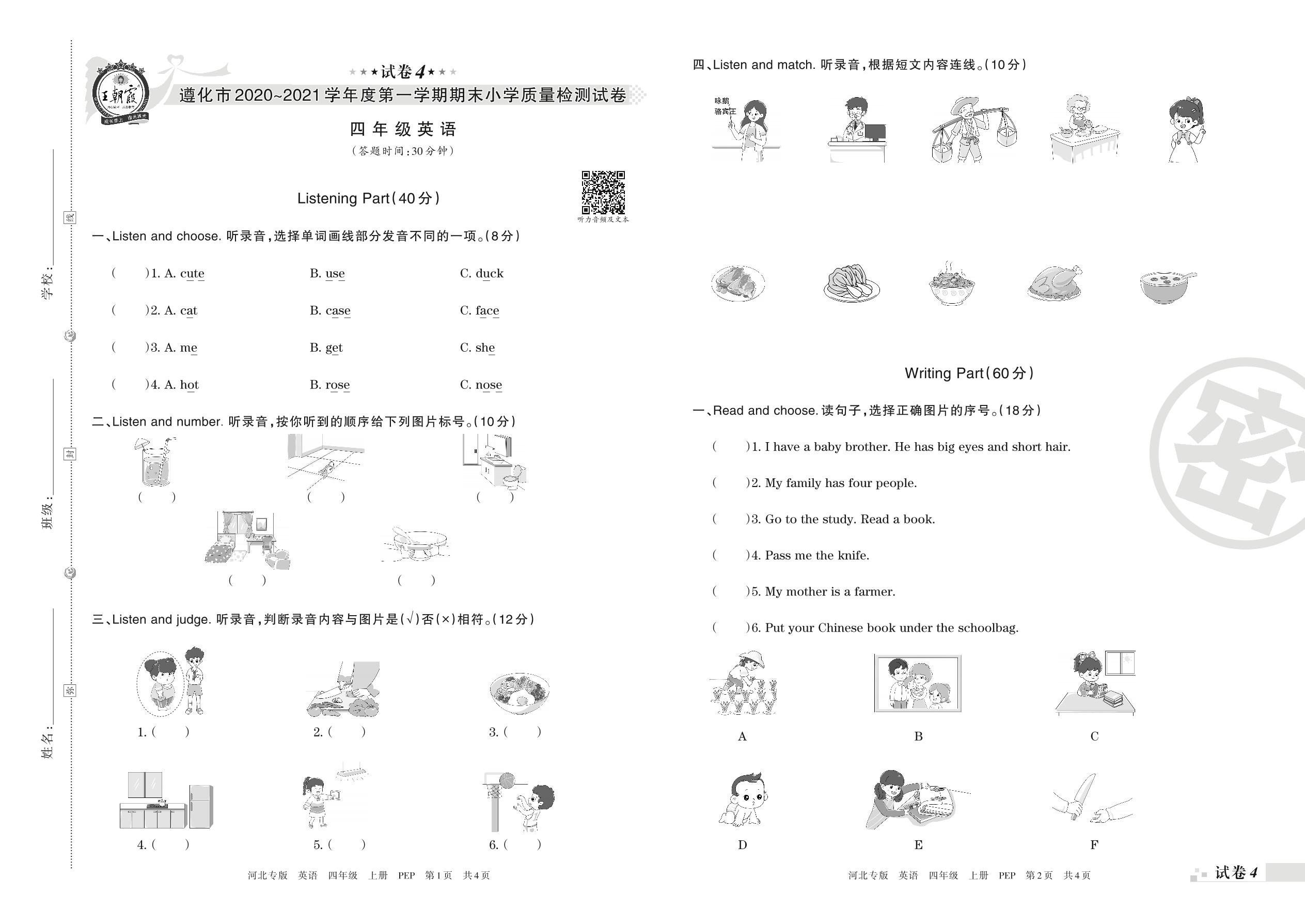 遵化市2020~2021学年度第一学期期末小学质量检测试卷四年级英语(人教PEP版)【4】