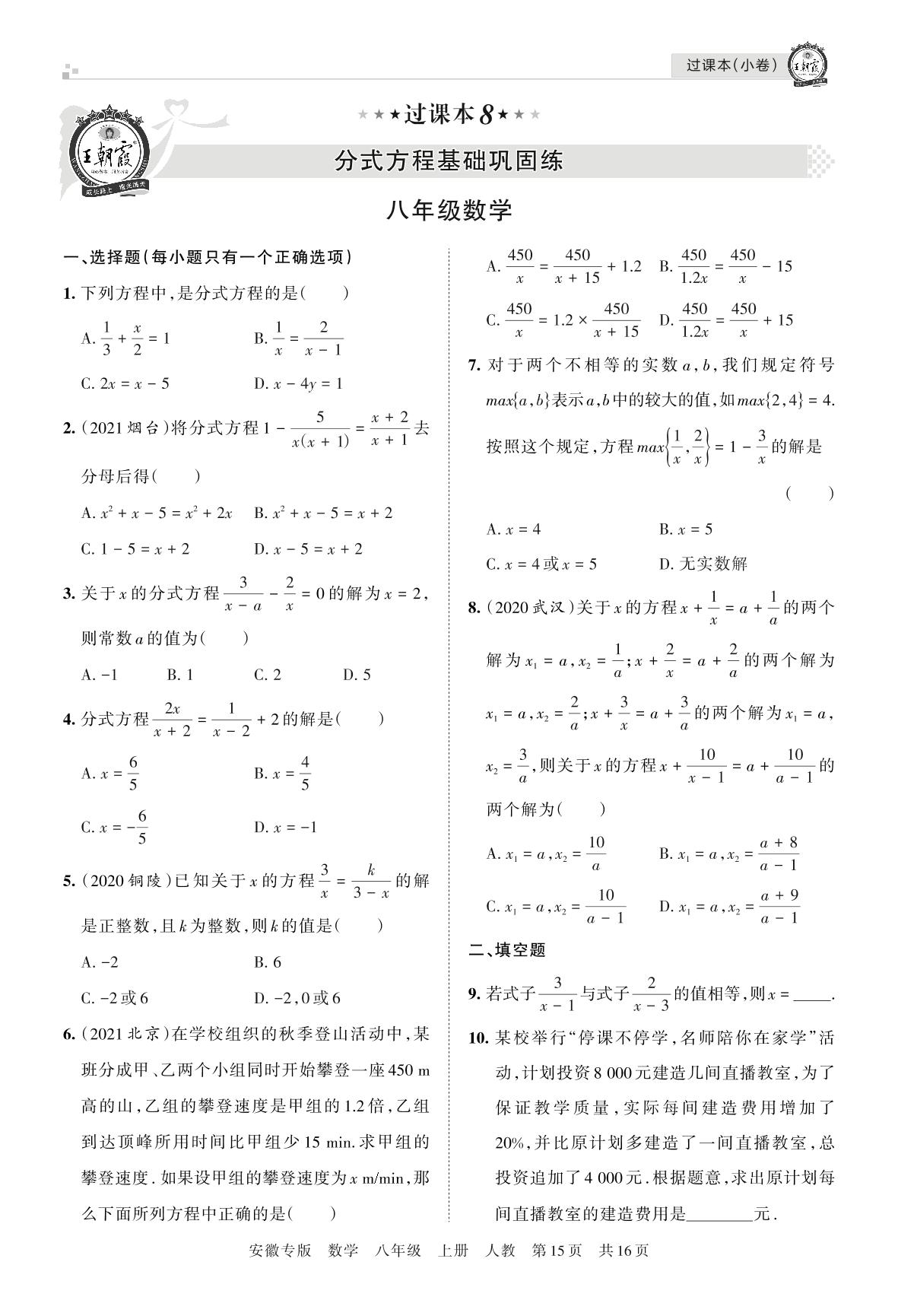 王朝霞期末过课本——分式方程基础巩固练八年级上册数学(人教版)【8】