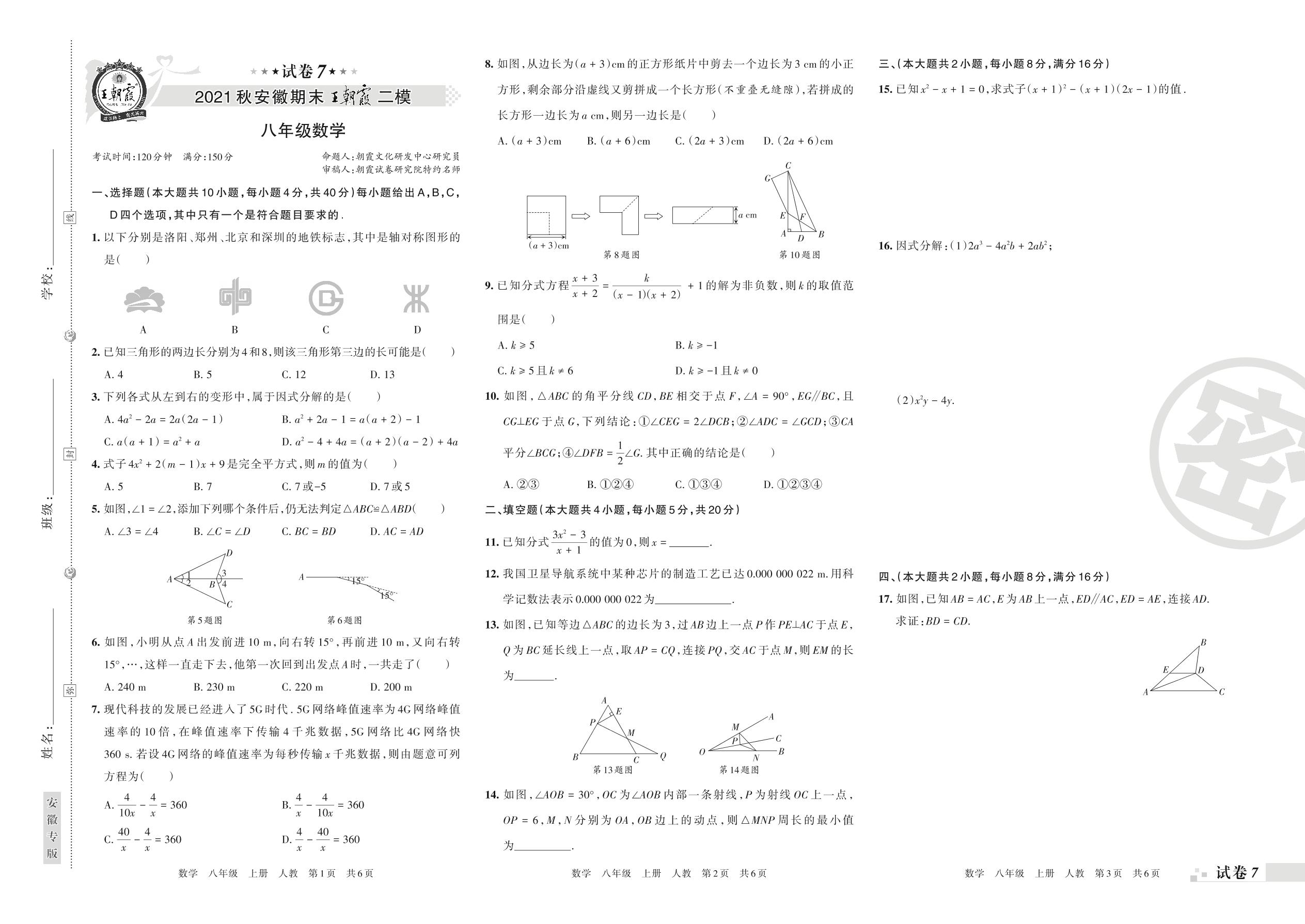 王朝霞期末模拟卷八年级上册数学(人教版)【7】