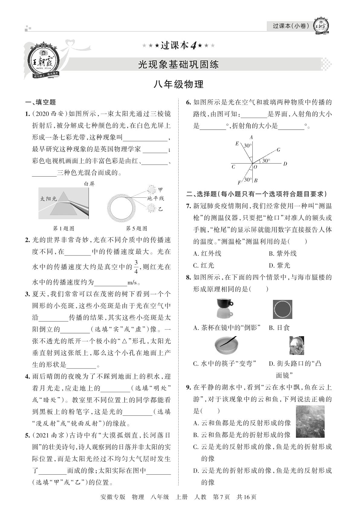 王朝霞期末过课本——光现象基础巩固练八年级上册物理(人教版)【4】