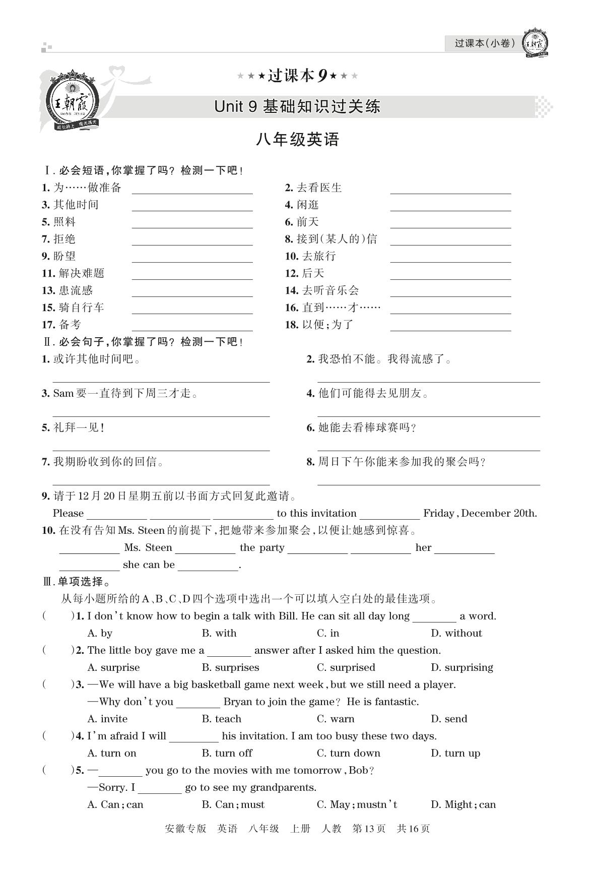 王朝霞期末过课本——Unit 9基础知识过关练八年级上册英语(人教版)【9】