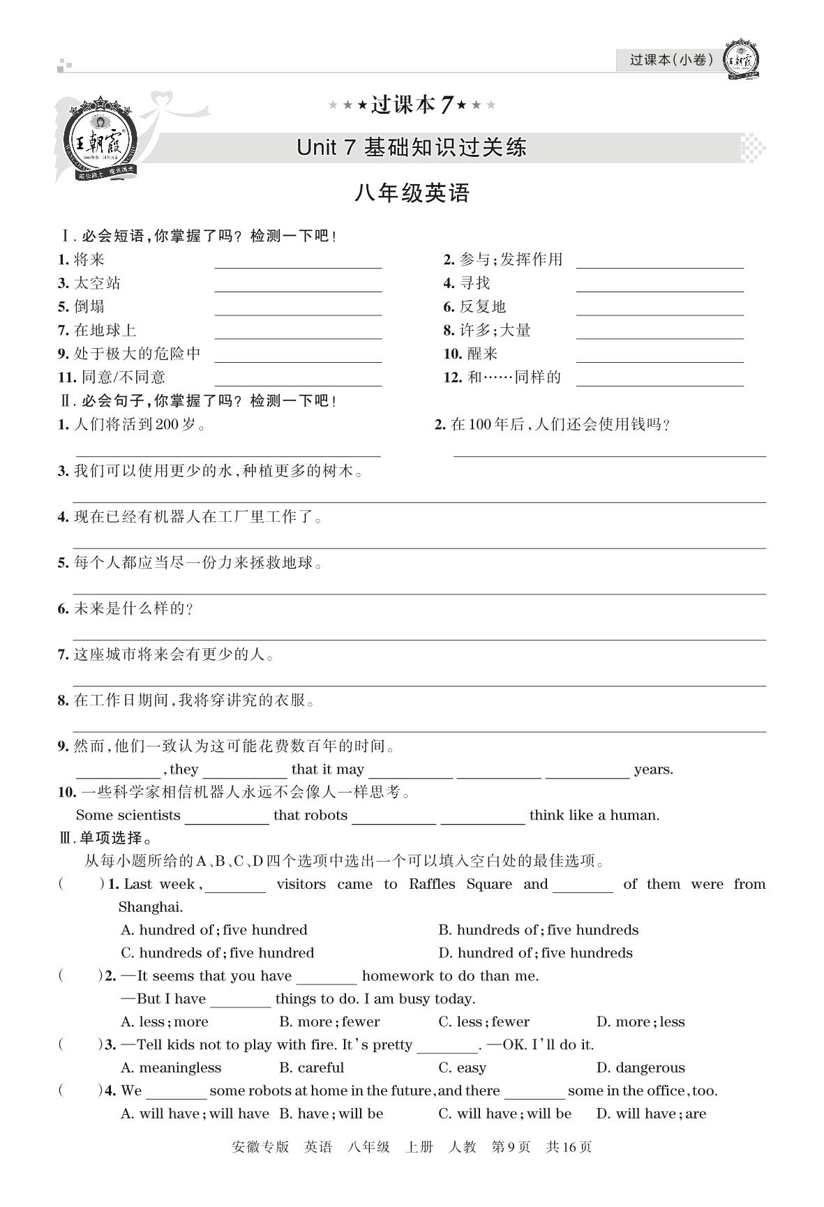 王朝霞期末过课本——Unit 7基础知识过关练八年级上册英语(人教版)【7】