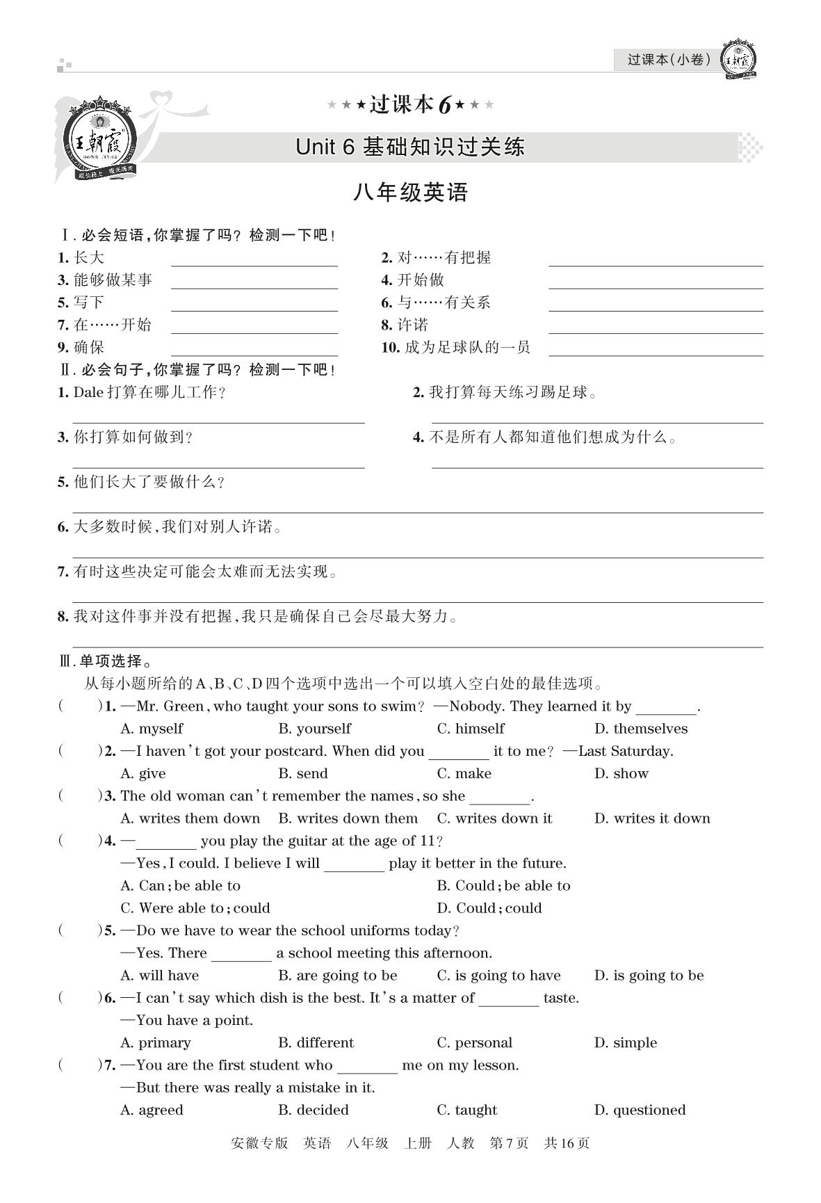 王朝霞期末过课本——Unit 6基础知识过关练八年级上册英语(人教版)【6】