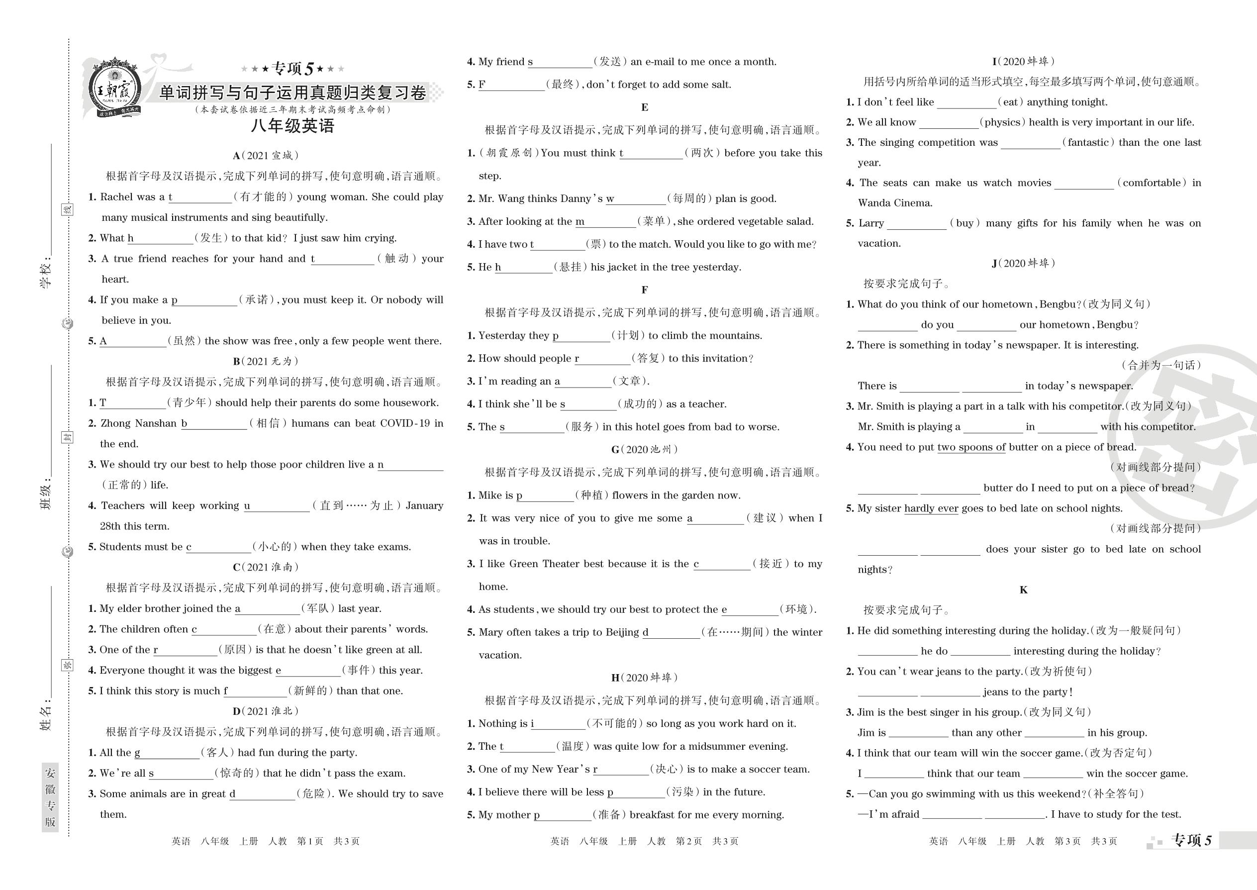 王朝霞期末专项卷——单词拼写与句子运用真题归类复习卷八年级上册英语(人教版)【5】
