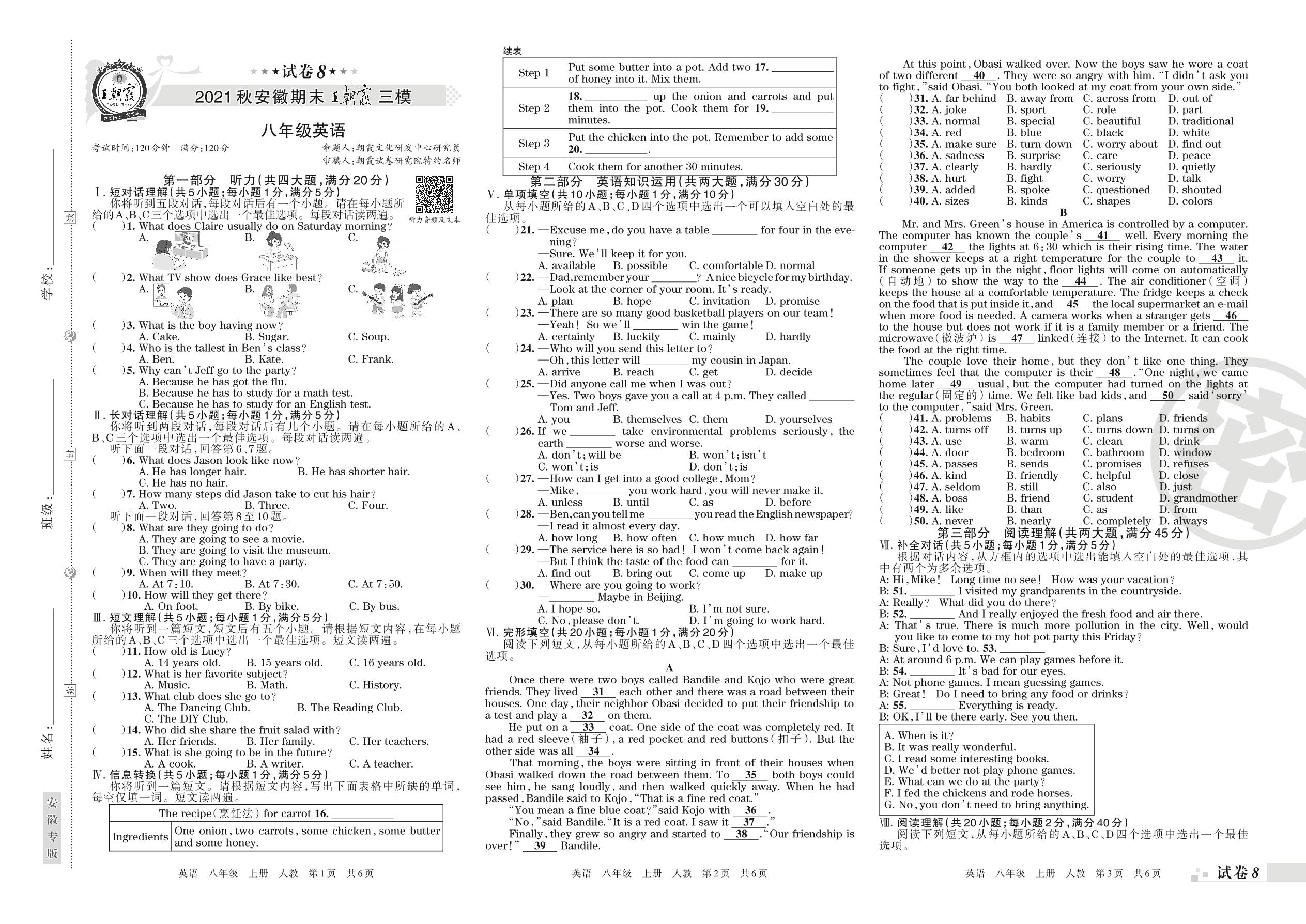 王朝霞期末模拟卷八年级上册英语(人教版)【8】