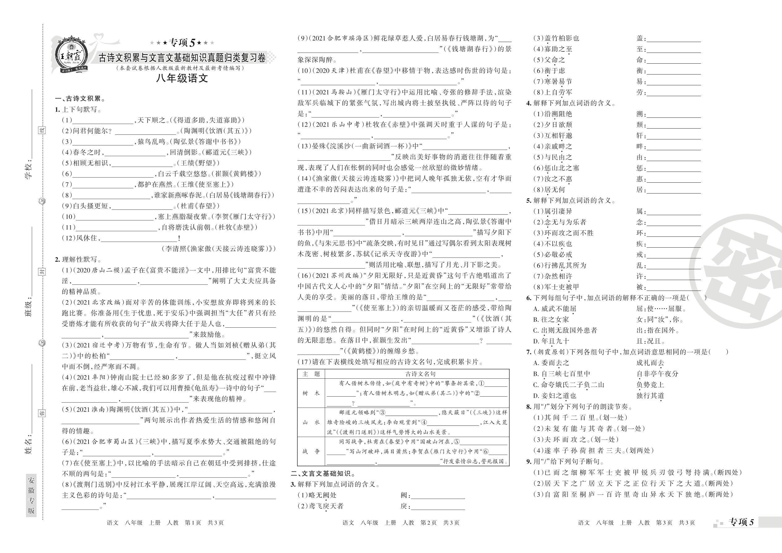 王朝霞期末专项卷——古诗文积累与文言文基础知识真题归类复习卷八年级上册语文(人教版)【5】