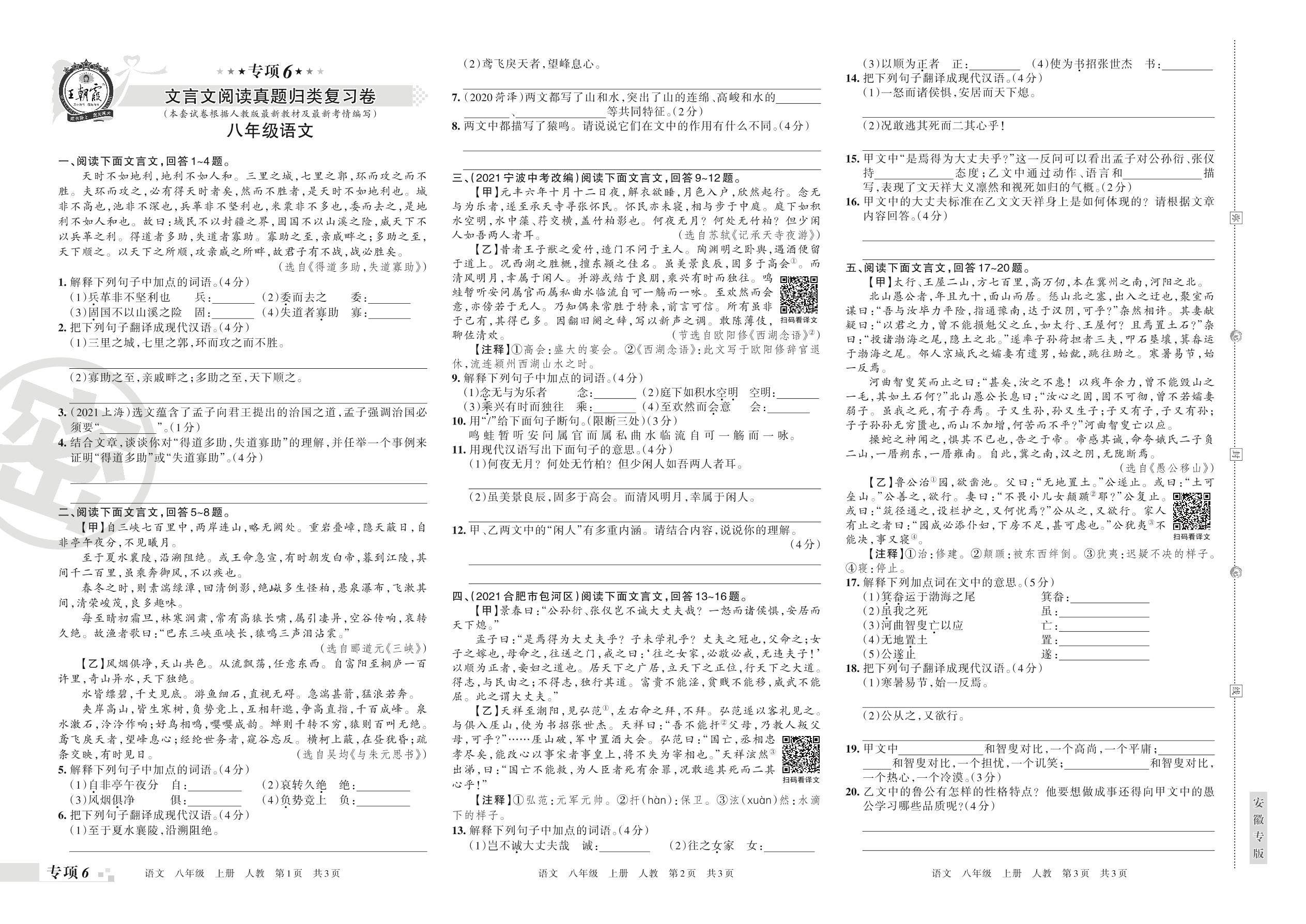 王朝霞期末专项卷——文言文阅读真题归类复习卷八年级上册语文(人教版)【6】