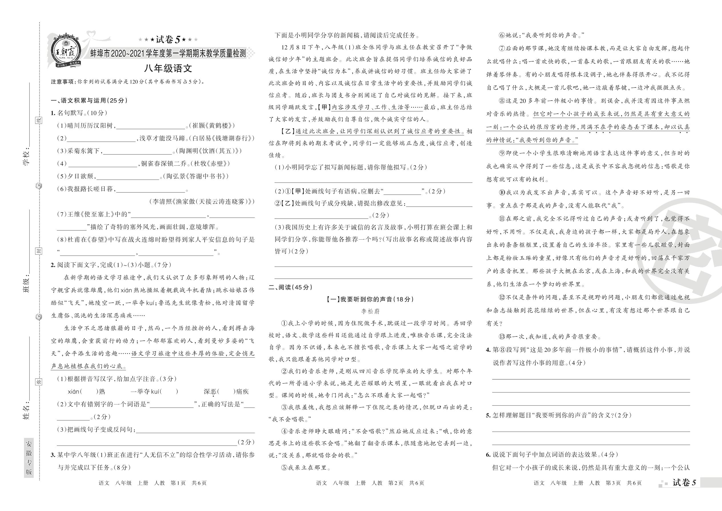 蚌埠市2020~2021学年度第一学期期末教学质量检测八年级语文(人教版)【5】