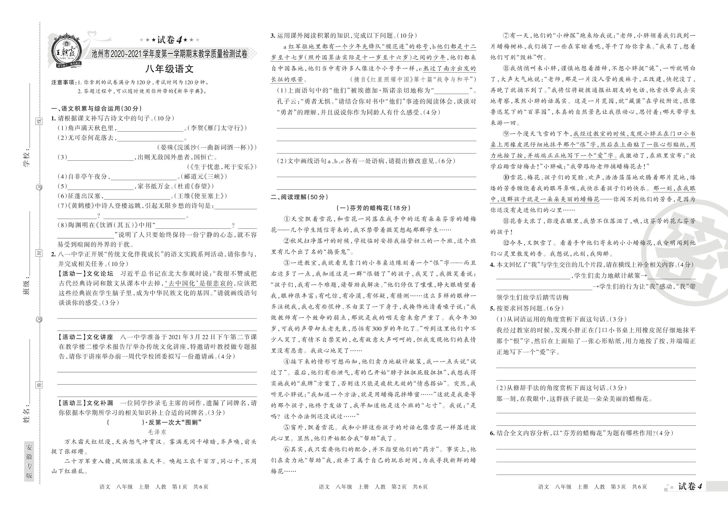 池州市2020~2021学年度第一学期期末教学质量检测试卷八年级语文(人教版)【4】