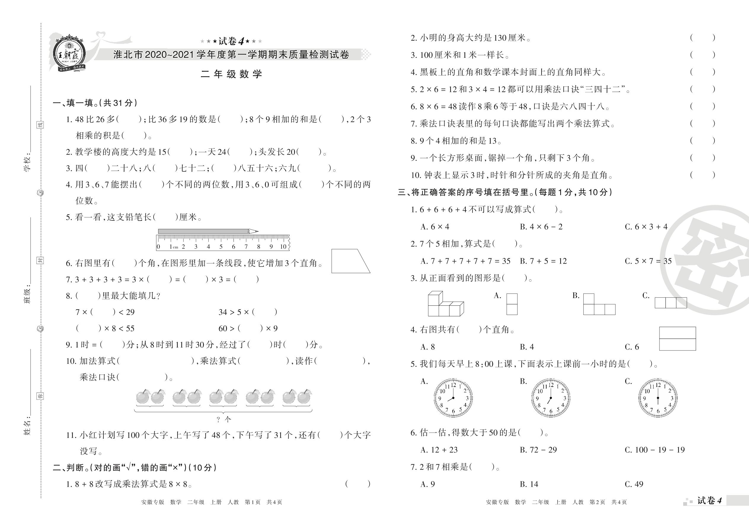 淮北市2020~2021学年度第一学期期末质量检测试卷二年级数学(人教版)【4】