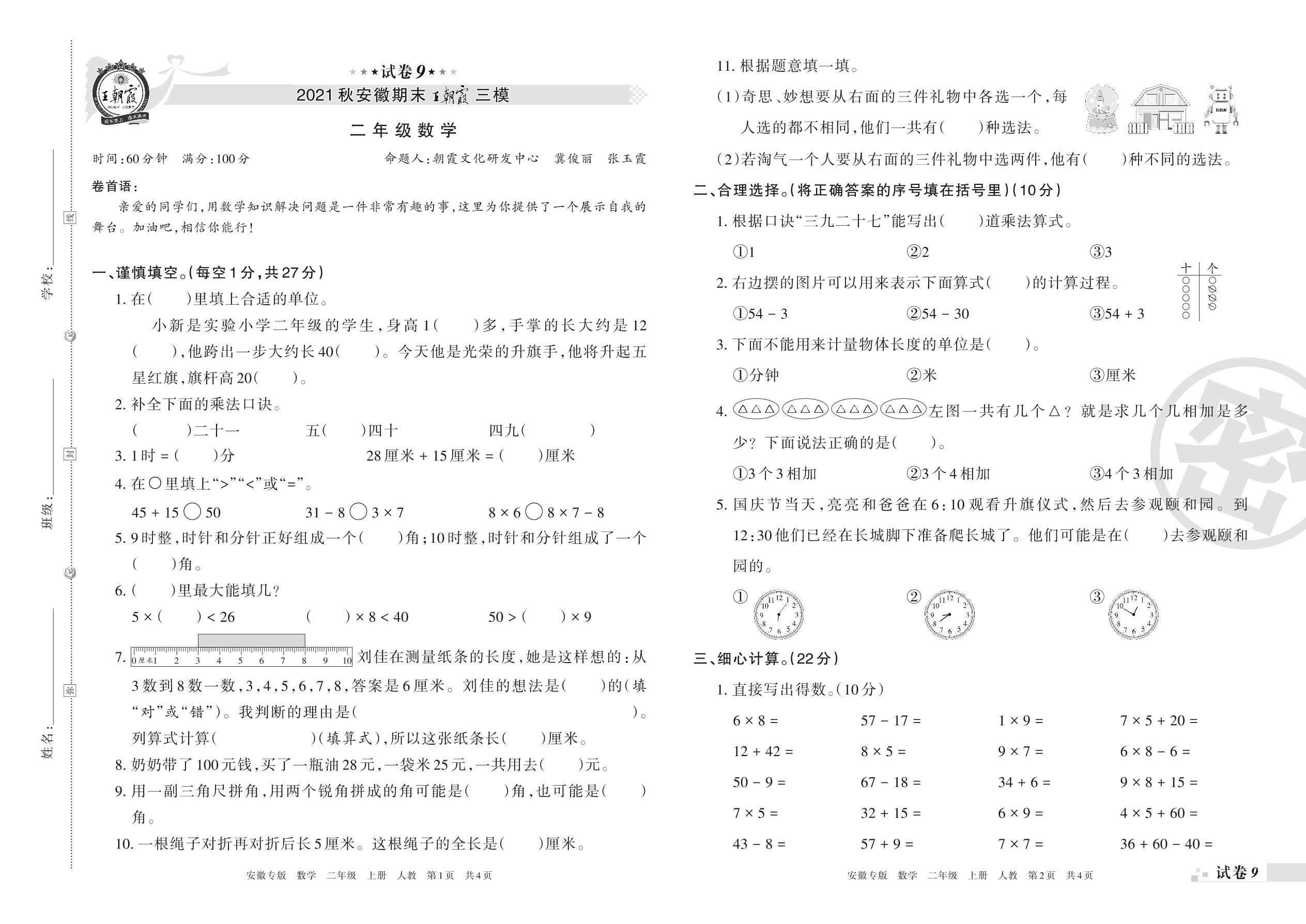王朝霞期末模拟卷二年级上册数学(人教版)_R211222172127208【9】