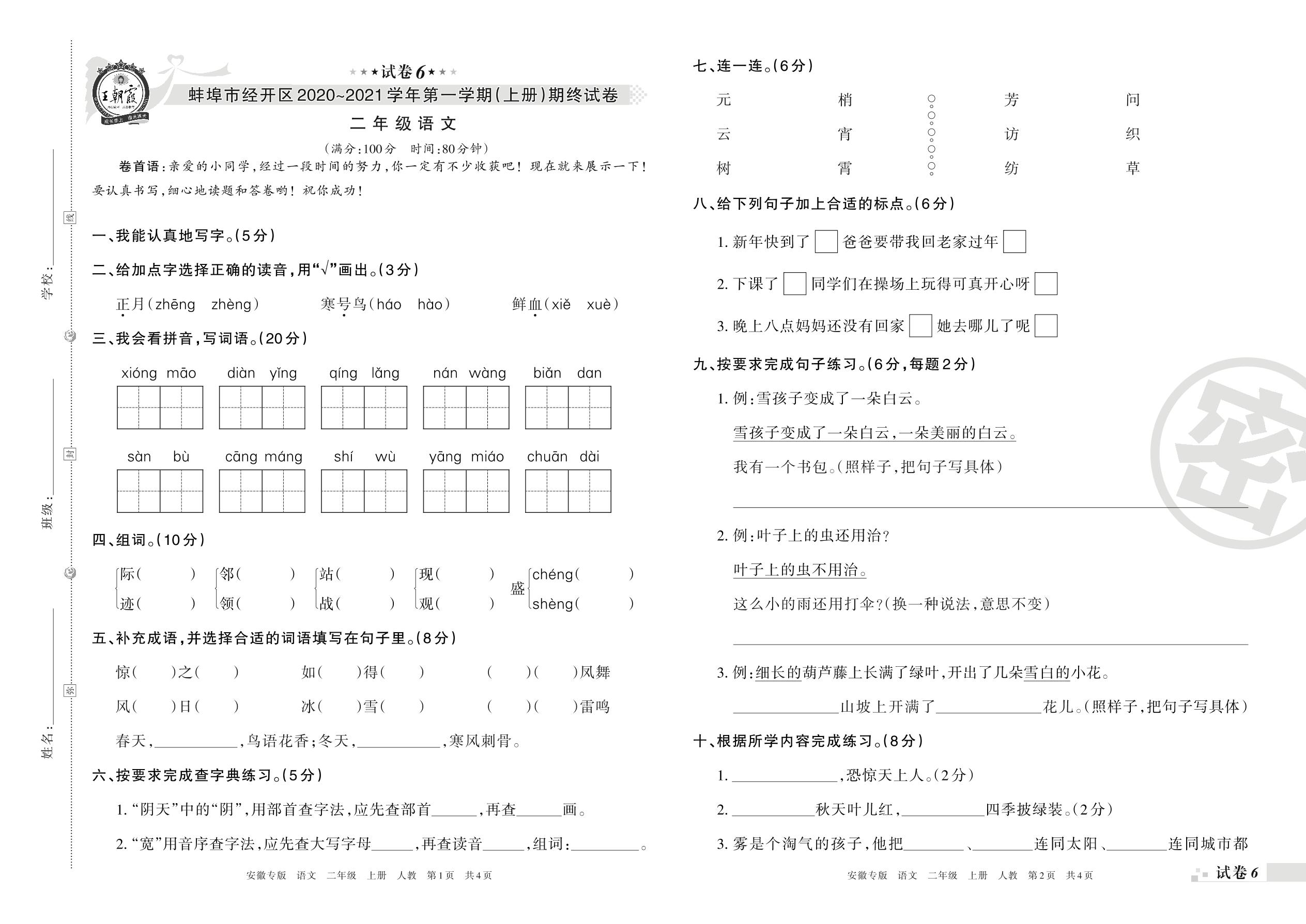 蚌埠市经开区2020~2021学年第一学期(上册)期终试卷二年级语文(人教版)【6】