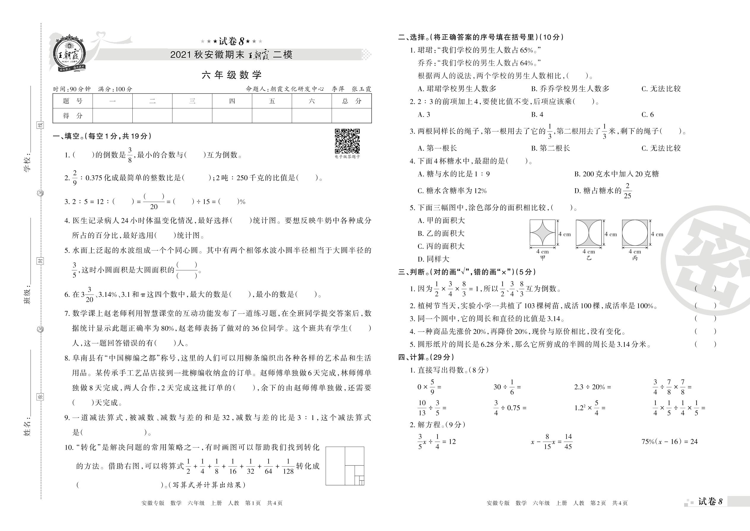 王朝霞期末模拟卷六年级上册数学(人教版)_R211223085621139【8】