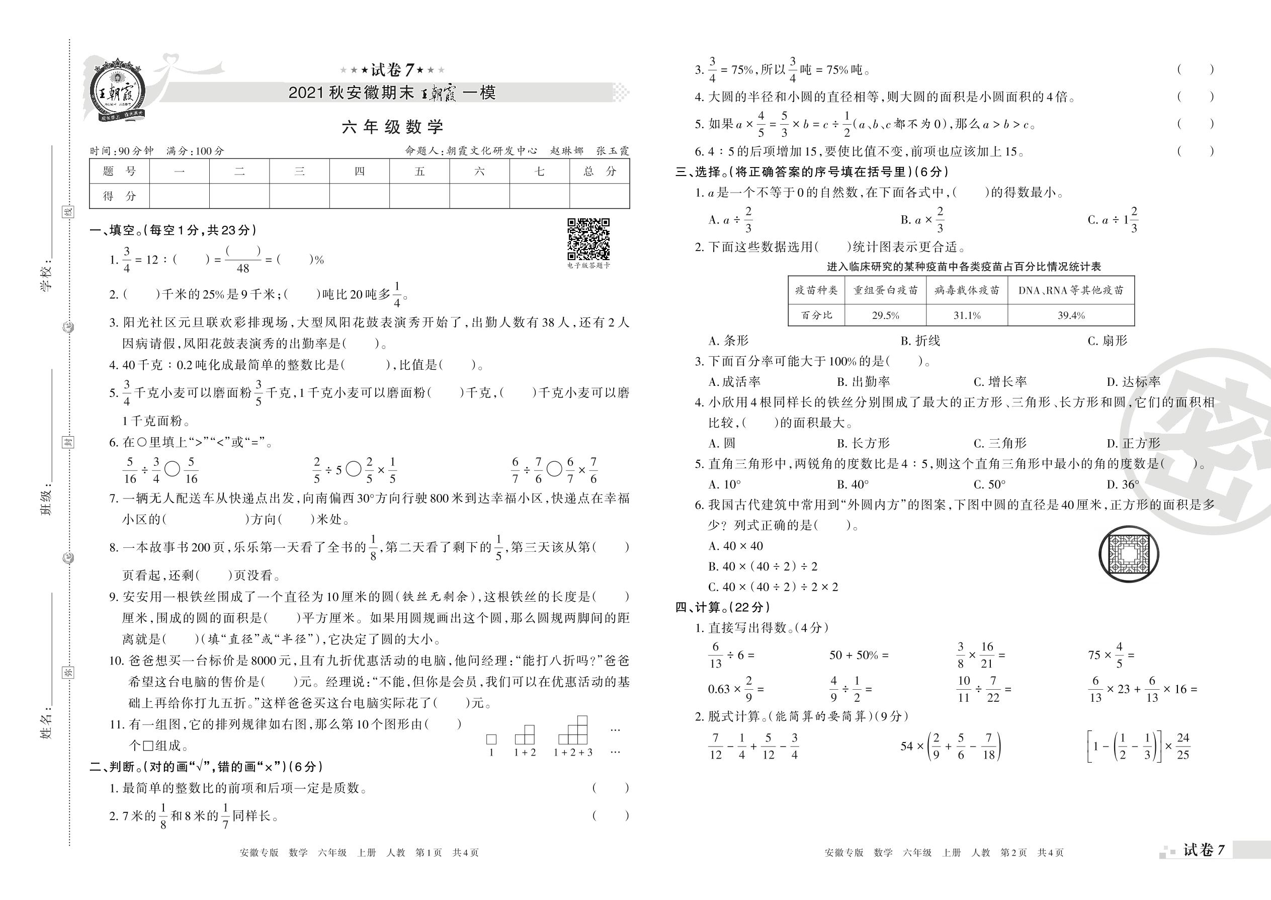 王朝霞期末模拟卷六年级上册数学(人教版)【7】