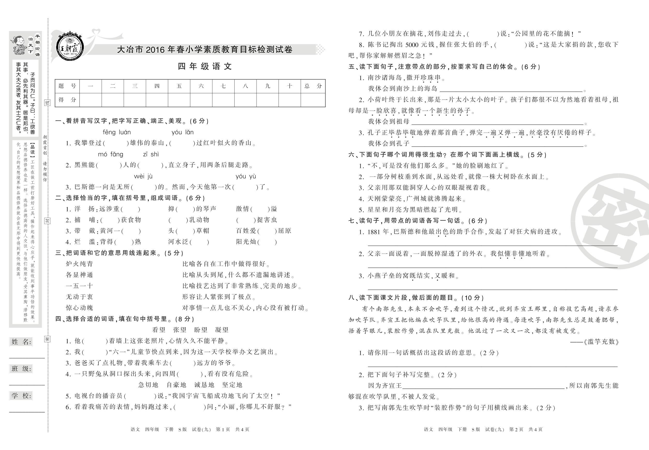 2015-2016学年第二学期大冶市四年级语文试卷(S版)【9】