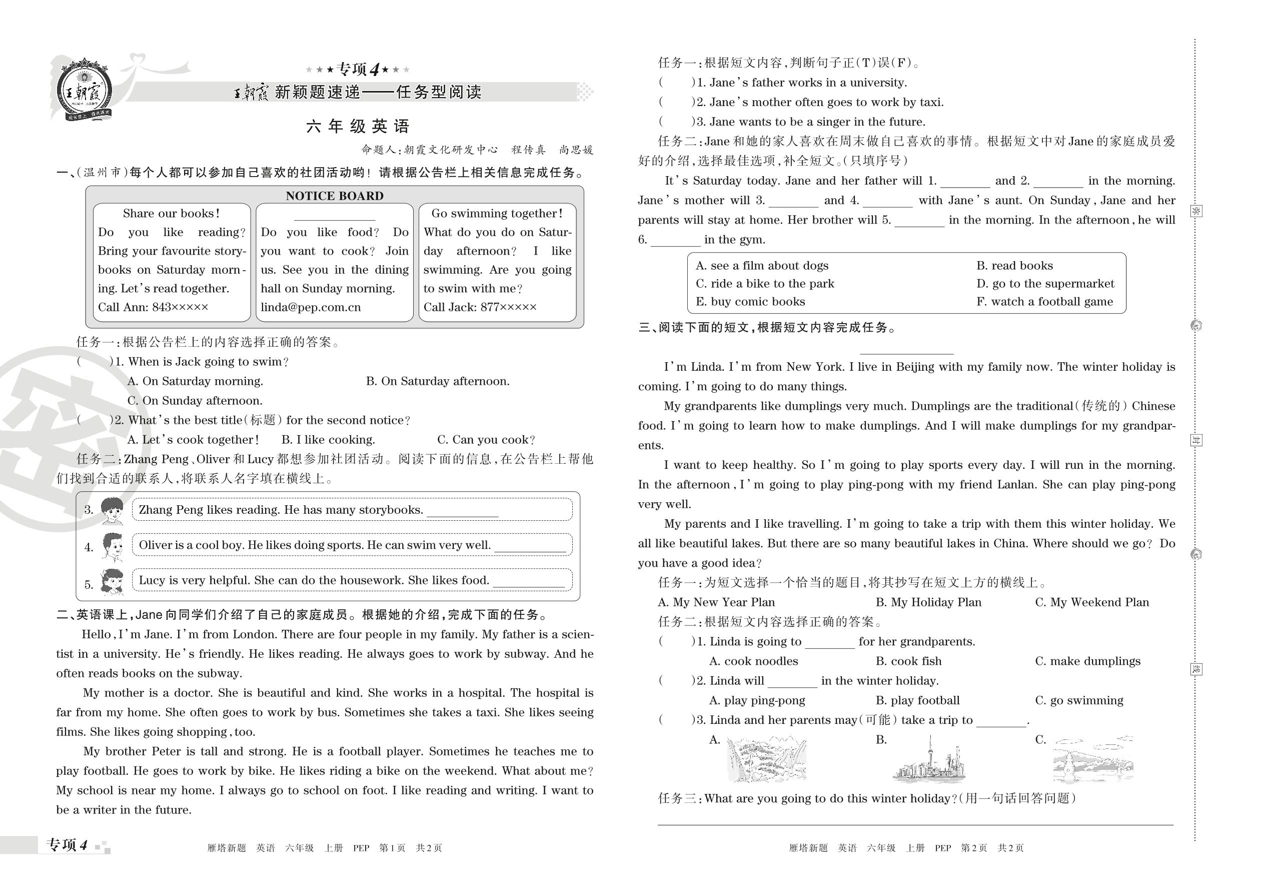 王朝霞期末专项卷——新颖题速递:任务型阅读六年级上册英语(人教PEP版)_R211223090412157【4】
