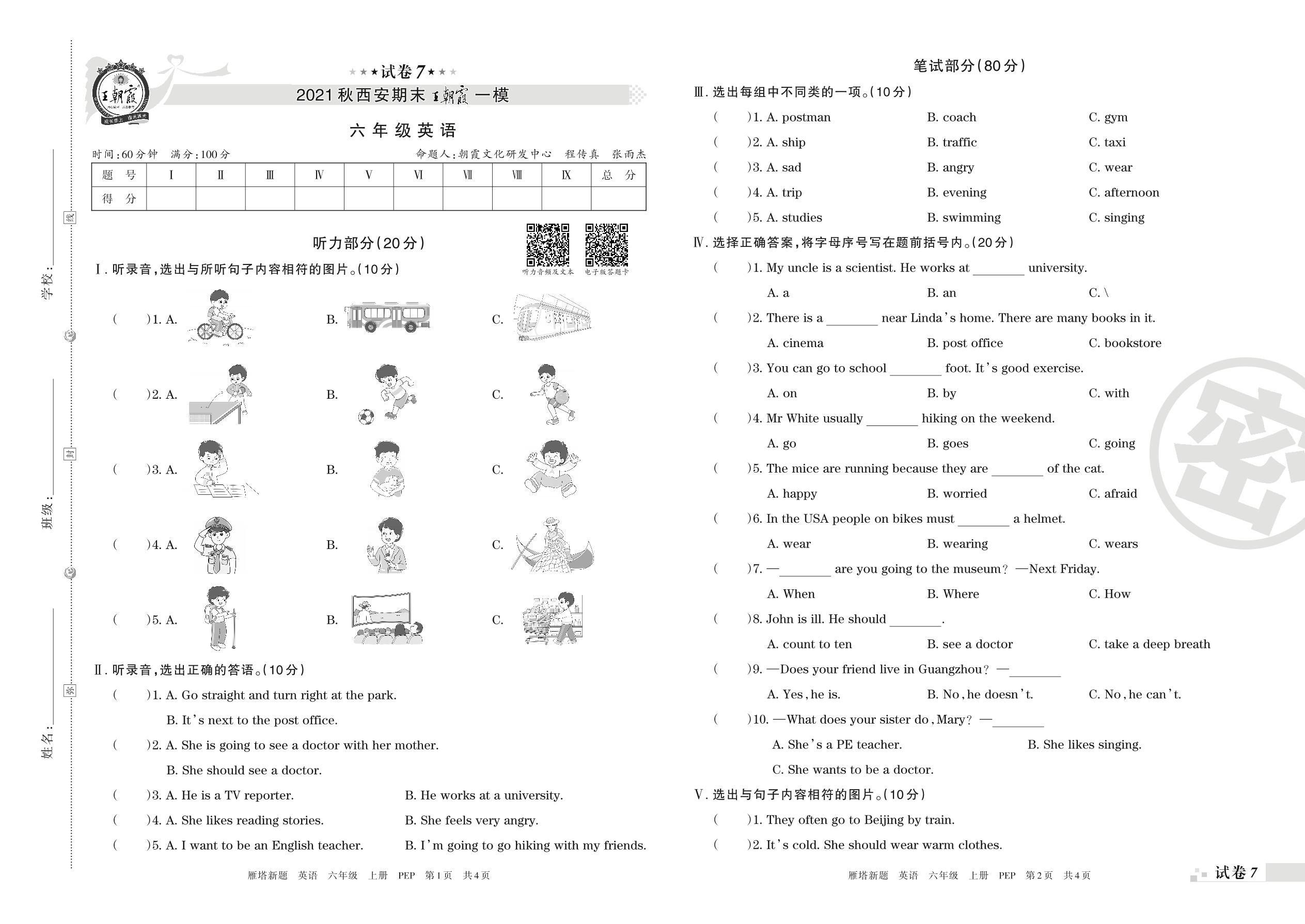 王朝霞期末模拟卷六年级上册英语(人教PEP版)_R211223090412415【7】