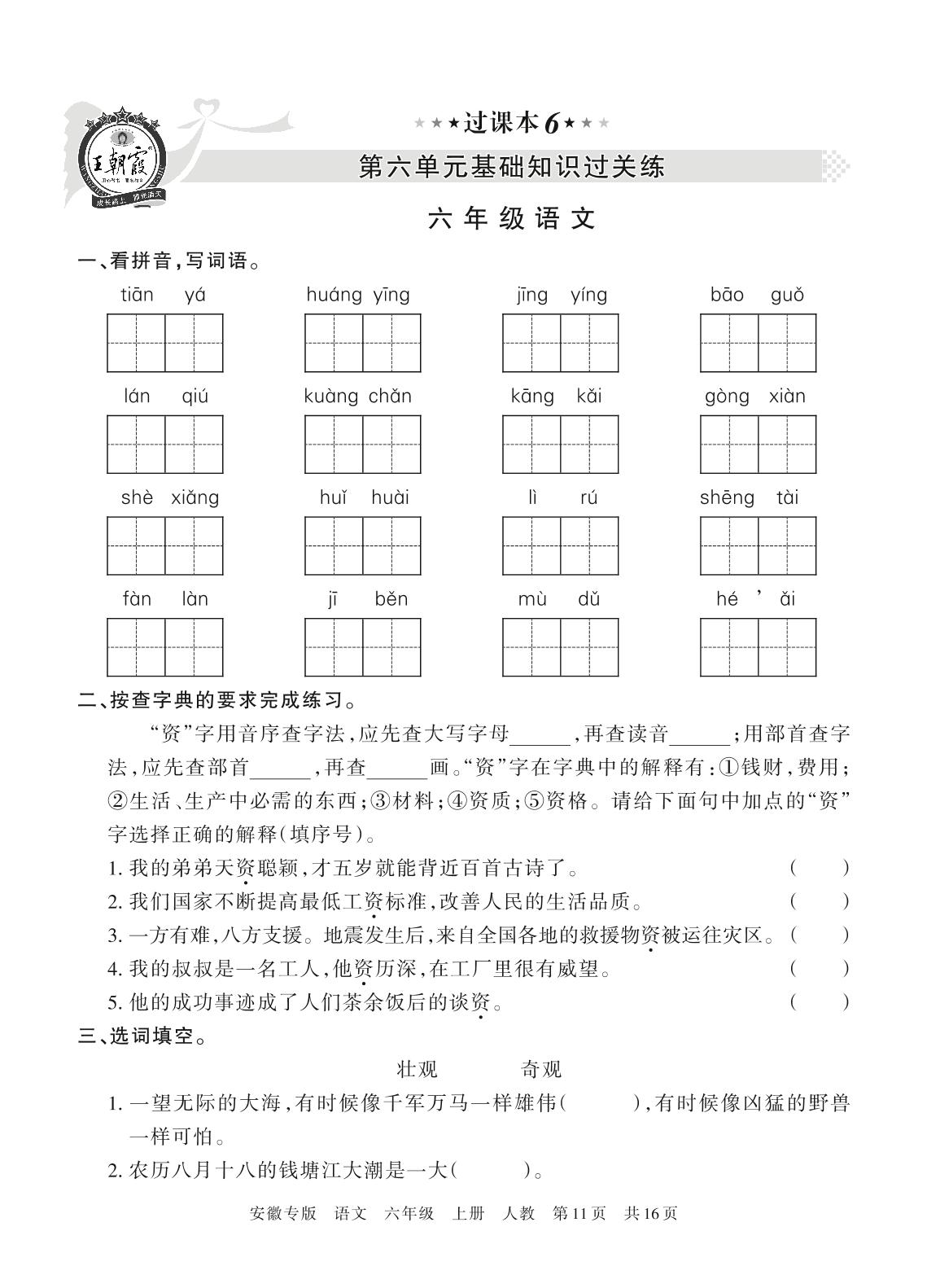 王朝霞期末过课本——第六单元基础知识过关练六年级上册语文(人教版)【6】