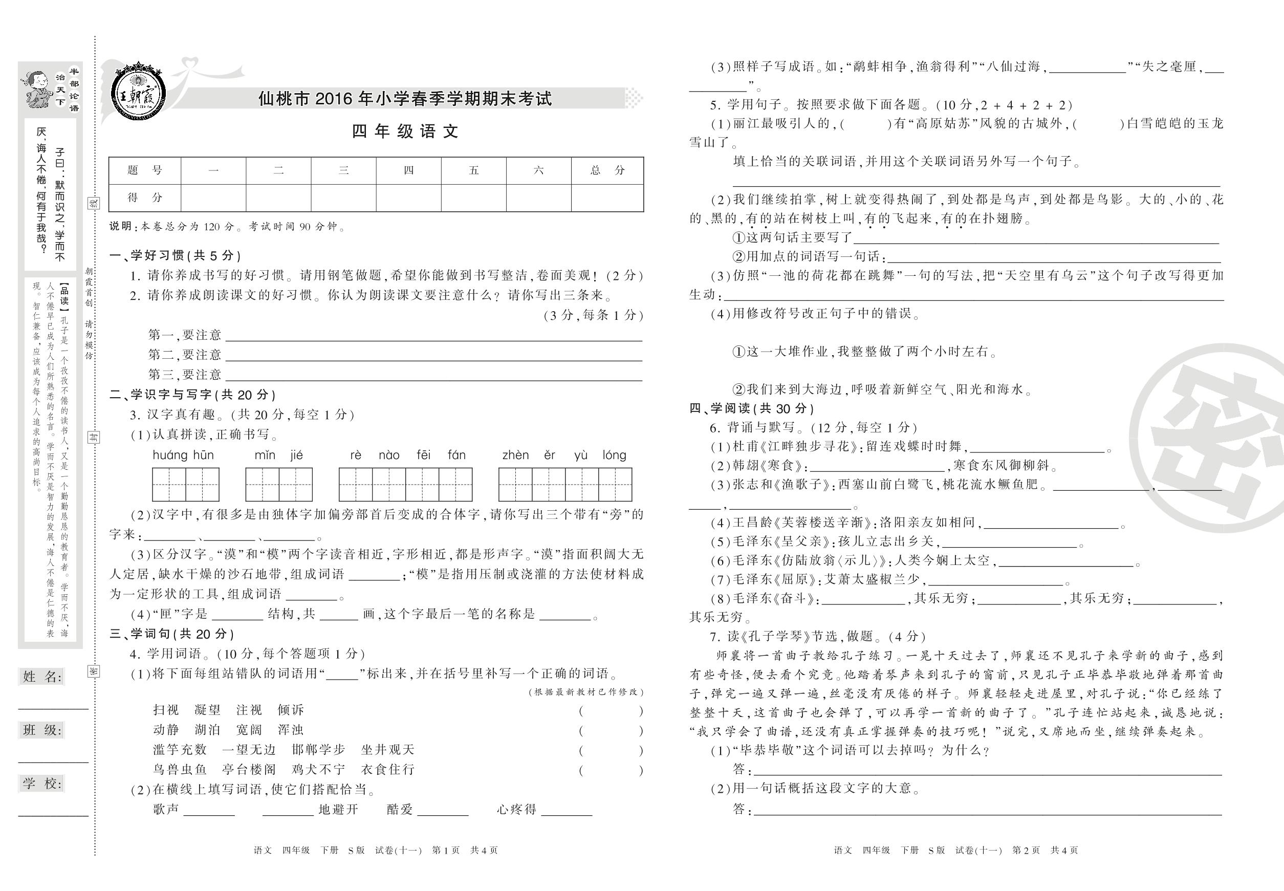 2015-2016学年第二学期仙桃市四年级语文试卷(S版)【11】