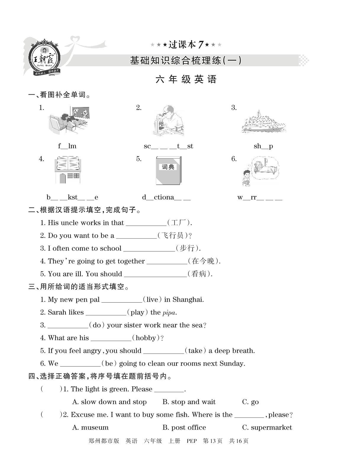 王朝霞期末过课本——基础知识综合梳理练(一)六年级上册英语(人教PEP版)_R211223091053697【7】
