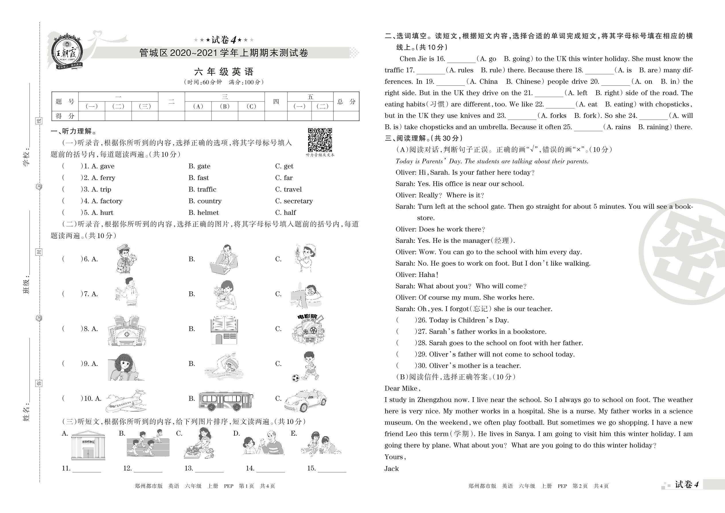 管城区2020~2021学年上期期末测试卷六年级英语(人教PEP版)【4】
