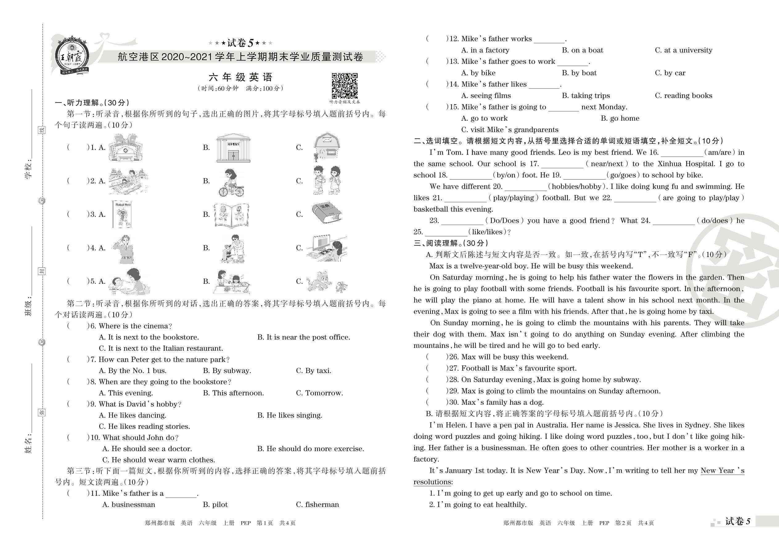 航空港区2020~2021学年上学期期末学业质量测试卷六年级英语(人教PEP版)【5】