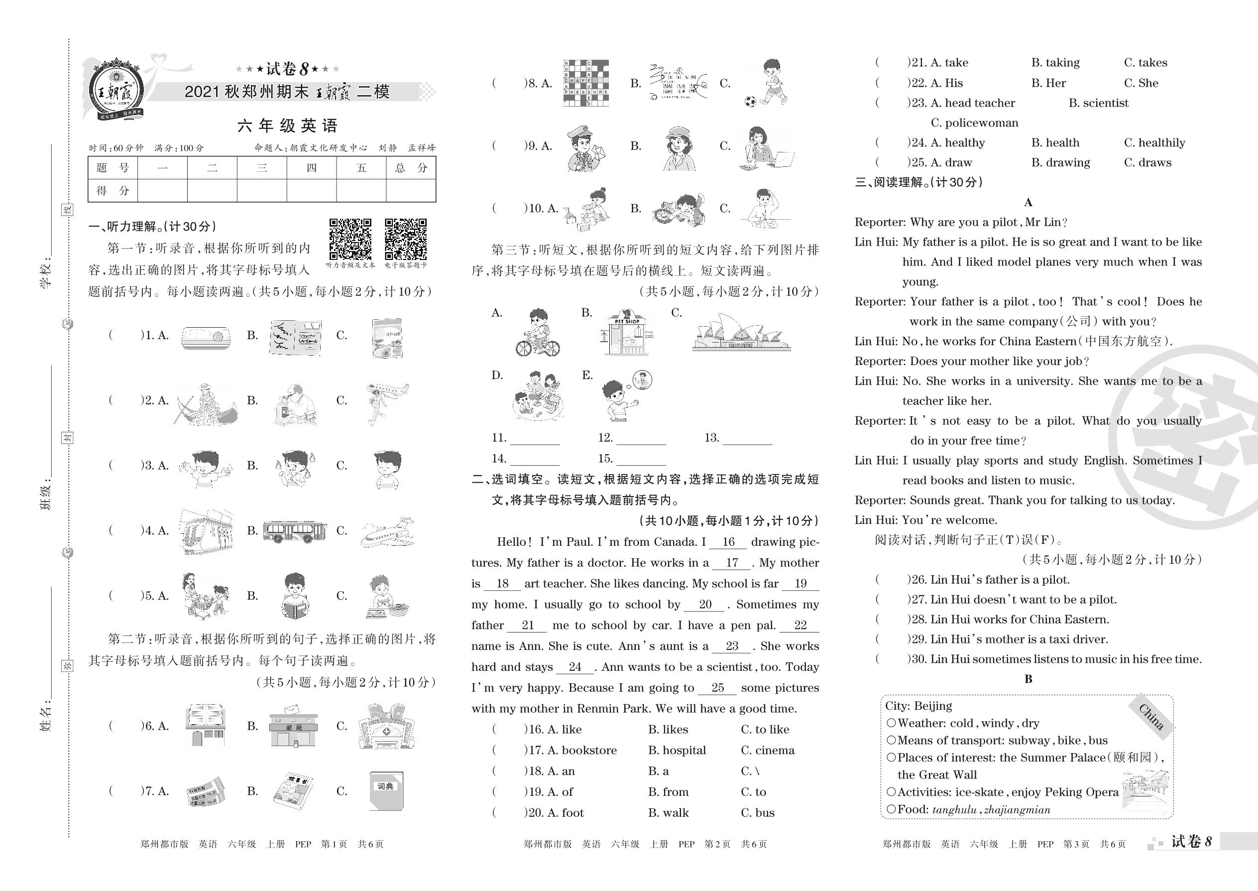 王朝霞期末模拟卷六年级上册英语(人教PEP版)_R211223091054156【8】