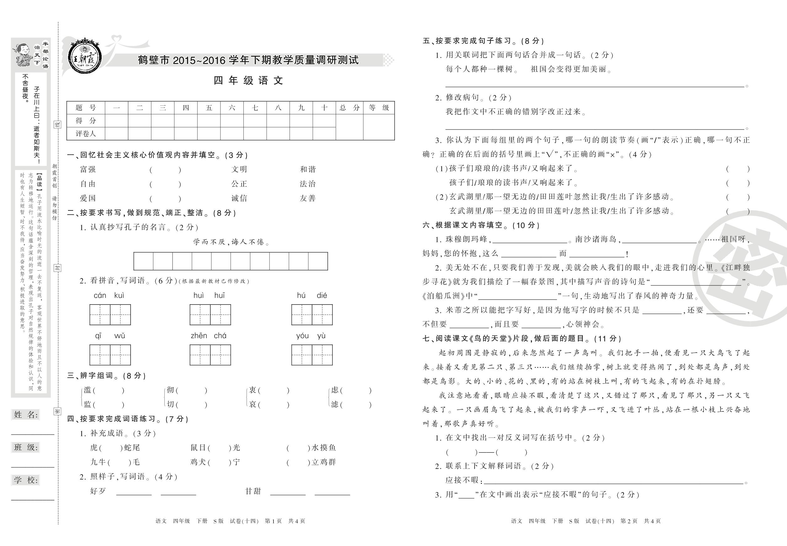 2015-2016学年第二学期鹤壁市四年级语文试卷(S版)【14】