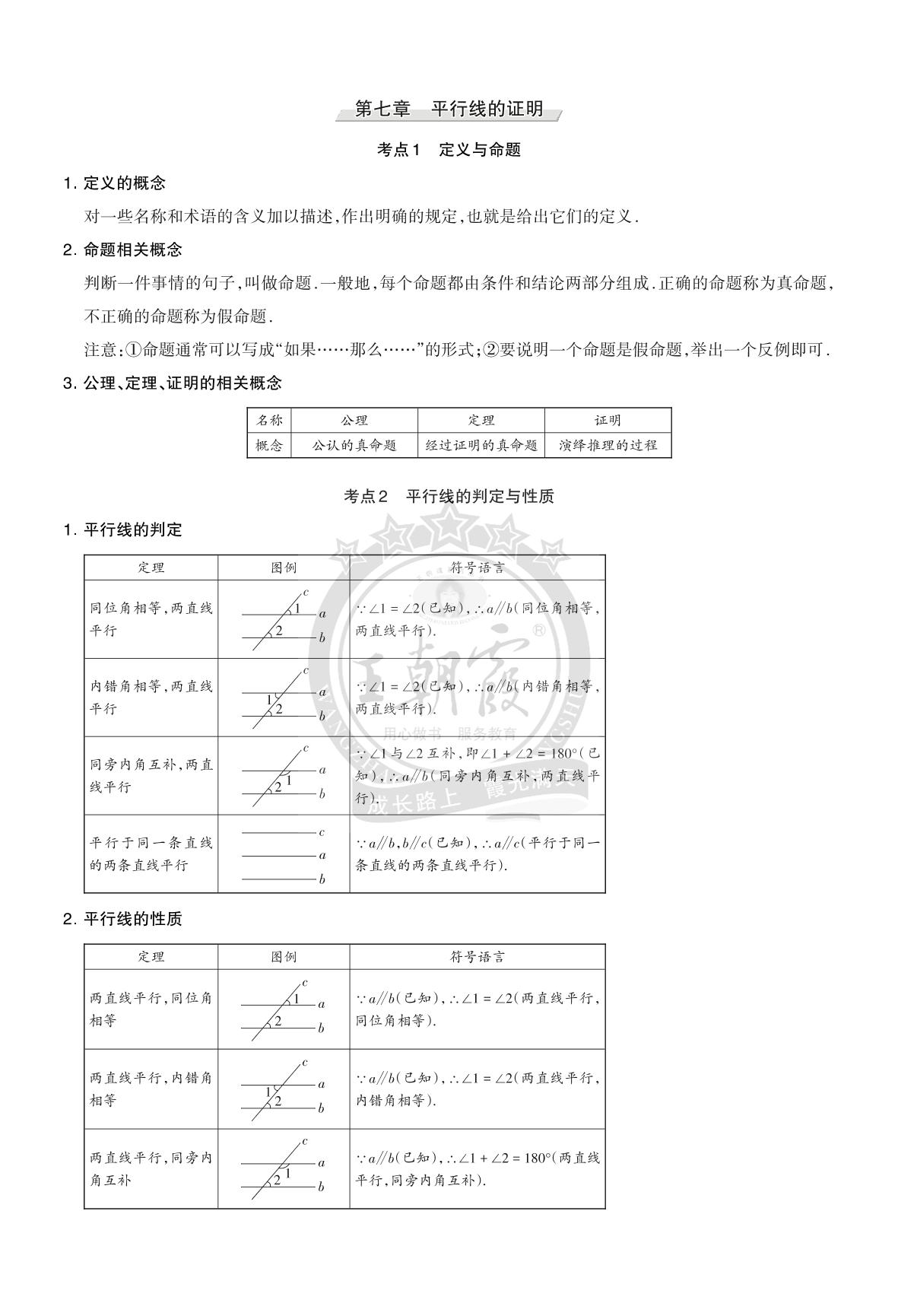 王朝霞期末知识梳理——第七章 平行线的证明八年级上册数学(北师版)【7】