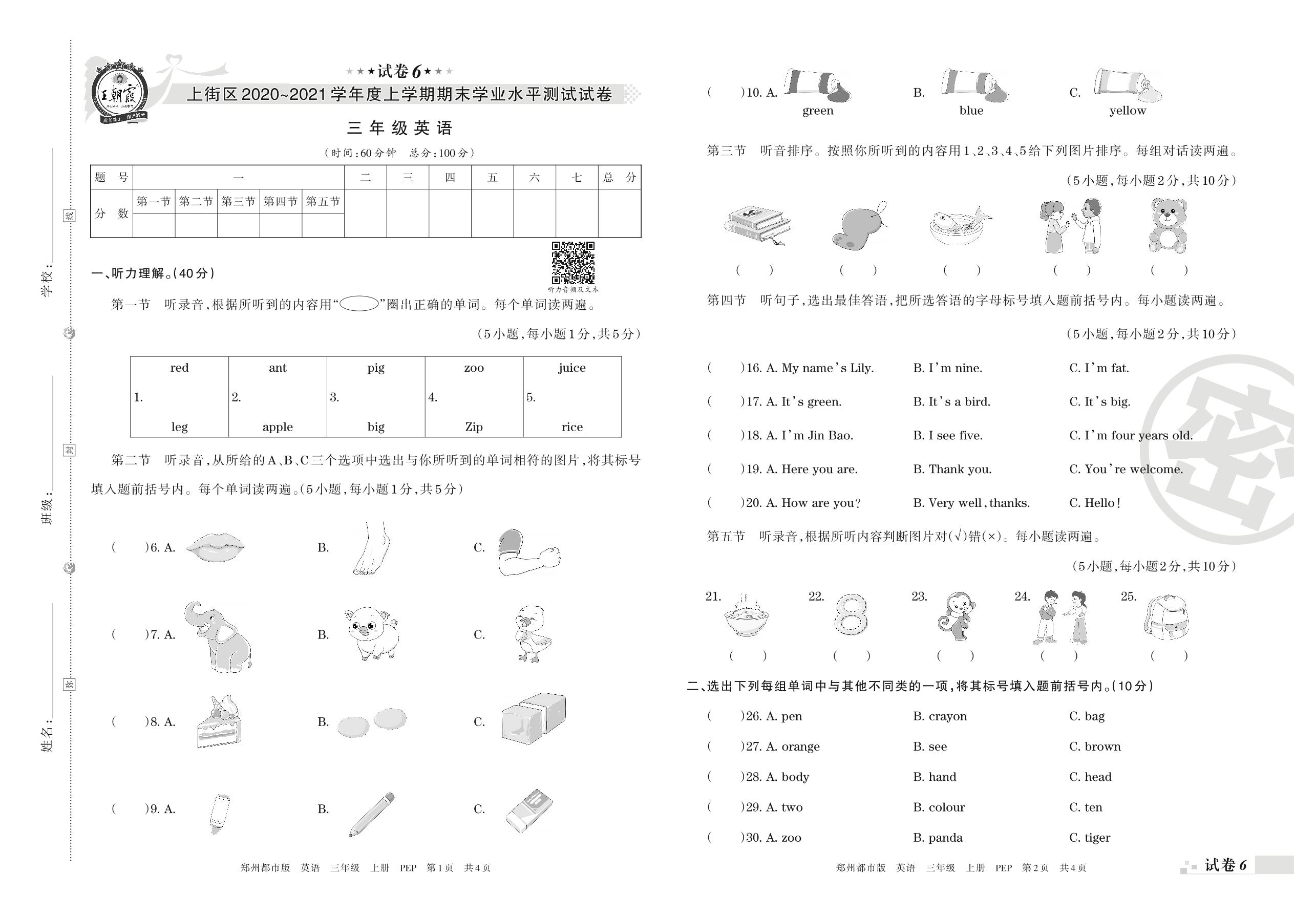 三年级英语人教PEP版(三起始)上册期末卷