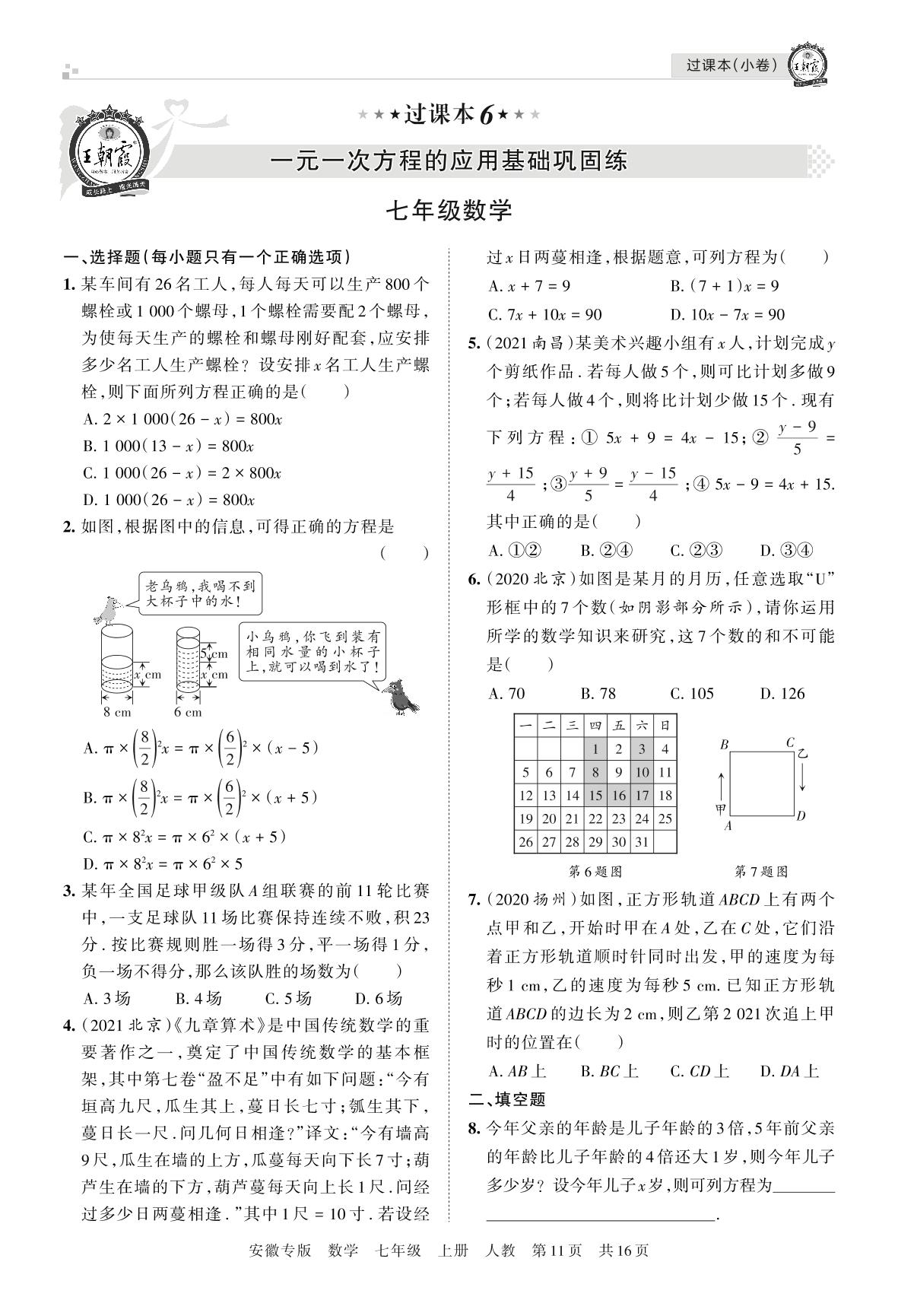 王朝霞期末过课本——一元一次方程的应用基础巩固练七年级上册数学(人教版)【6】