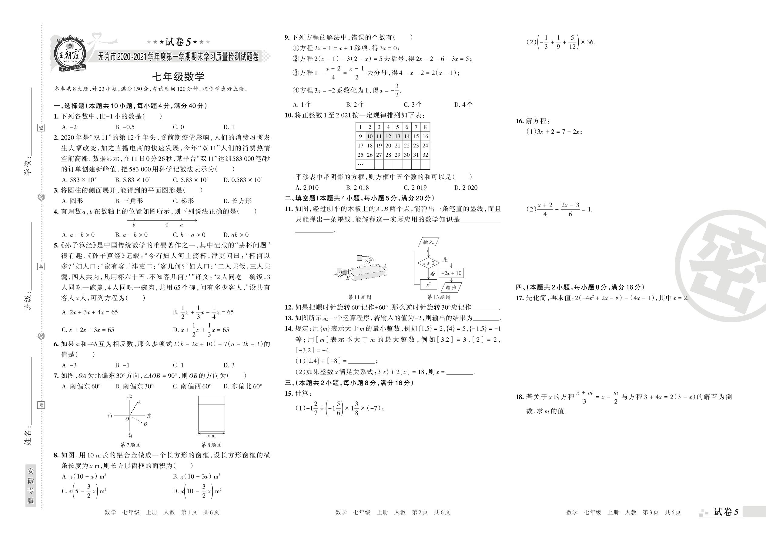 无为市2020~2021学年度第一学期期末学习质量检测试题卷七年级数学(人教版)【5】