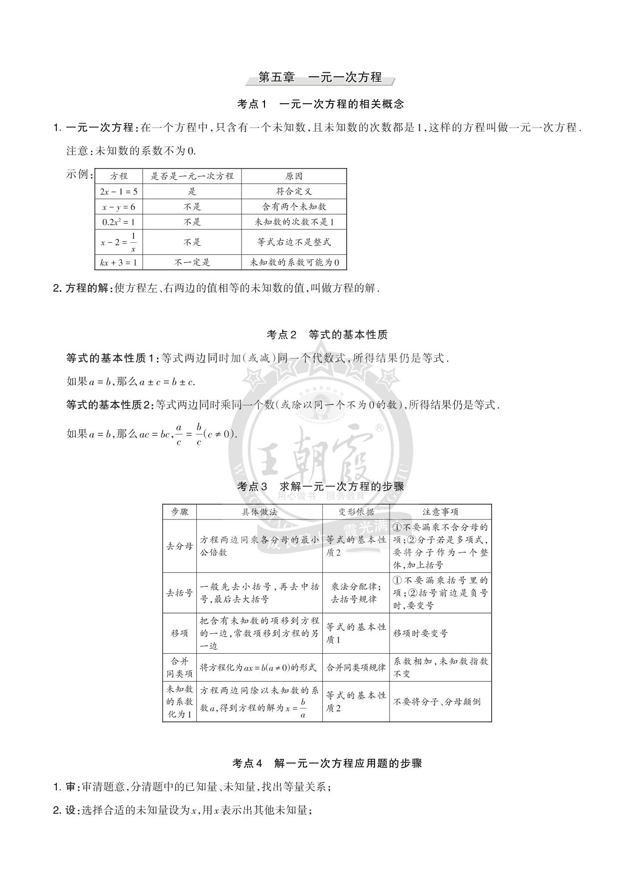 王朝霞期末知识梳理——第五章 一元一次方程七年级上册数学(北师版)【5】