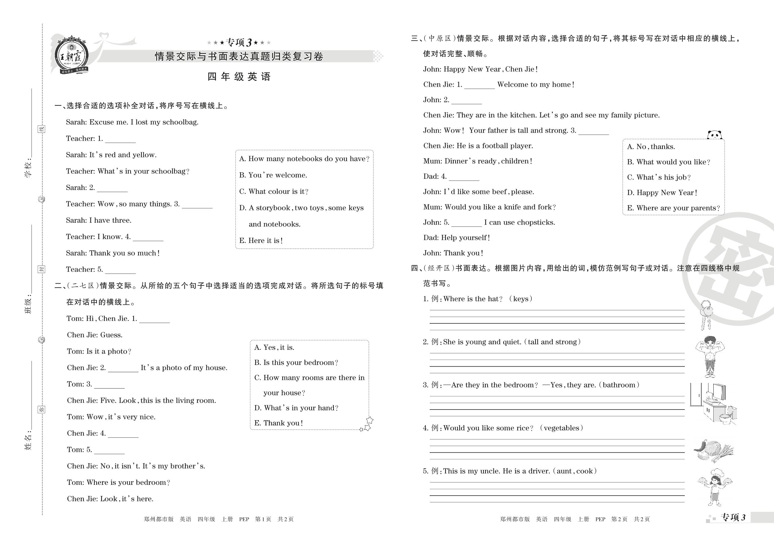 王朝霞期末专项卷——情景交际与书面表达真题归类复习卷四年级上册英语(人教PEP版)【3】