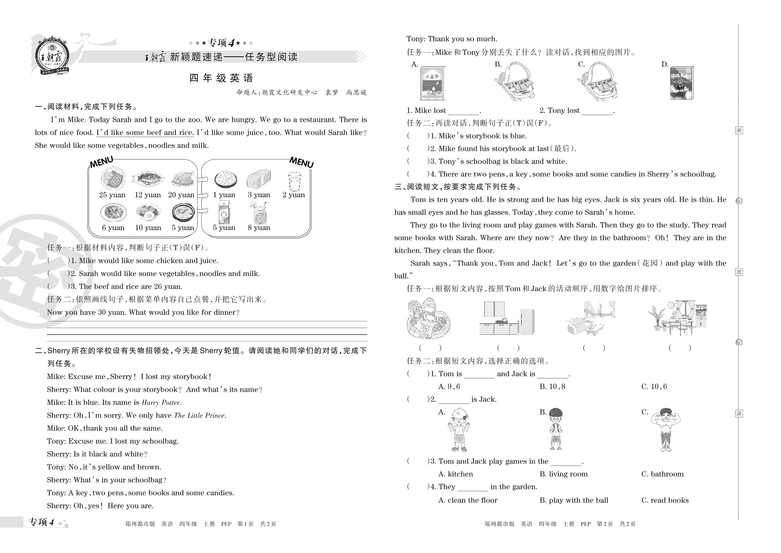 王朝霞期末专项卷——新颖题速递:任务型阅读四年级上册英语(人教PEP版)_R211223092629127【4】