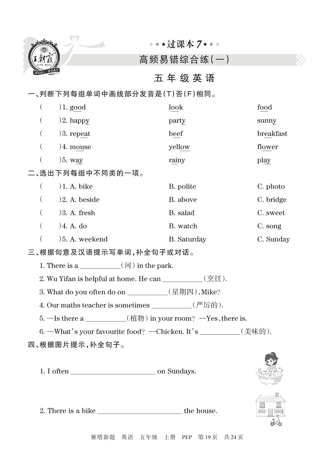 王朝霞期末过课本——高频易错综合练(一)五年级上册英语(人教PEP版)【7】