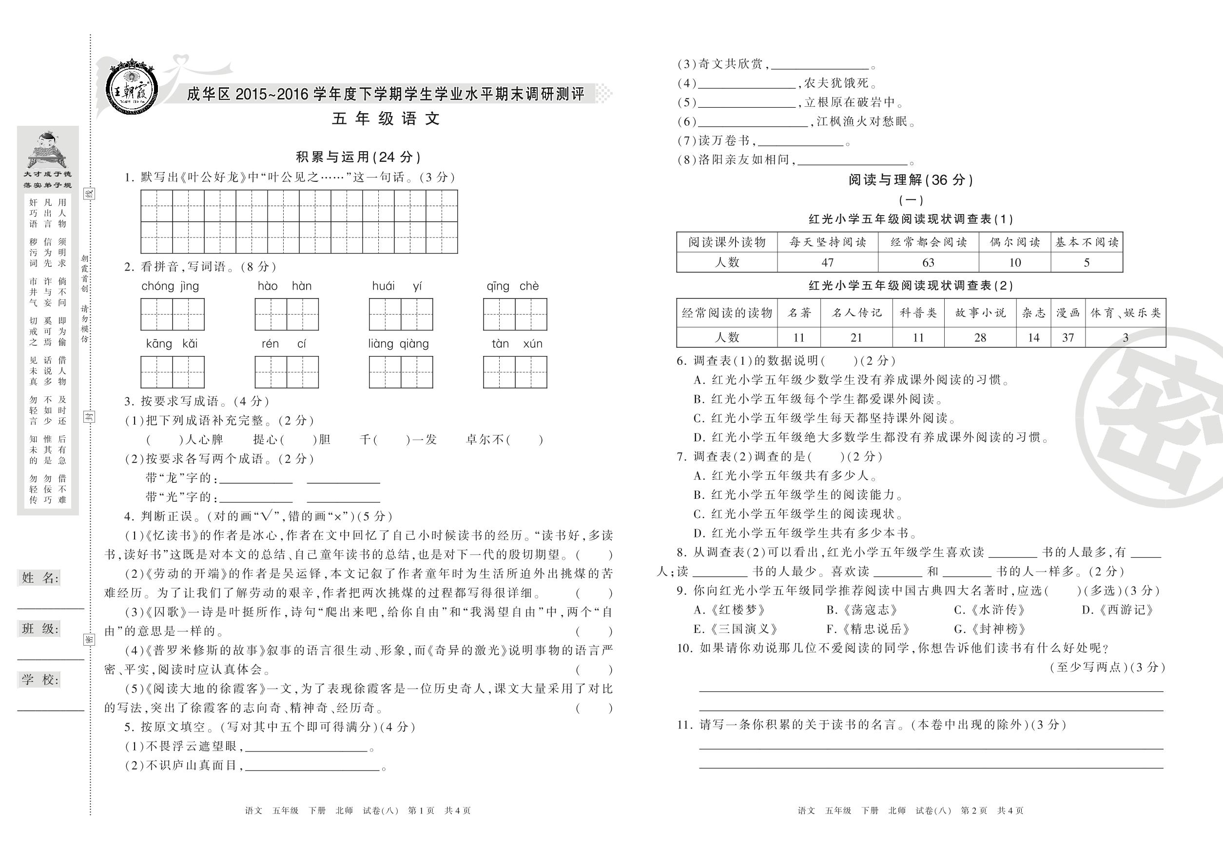 2015-2016学年第二学期成都市成华区五年级语文试卷(北师版)【8】