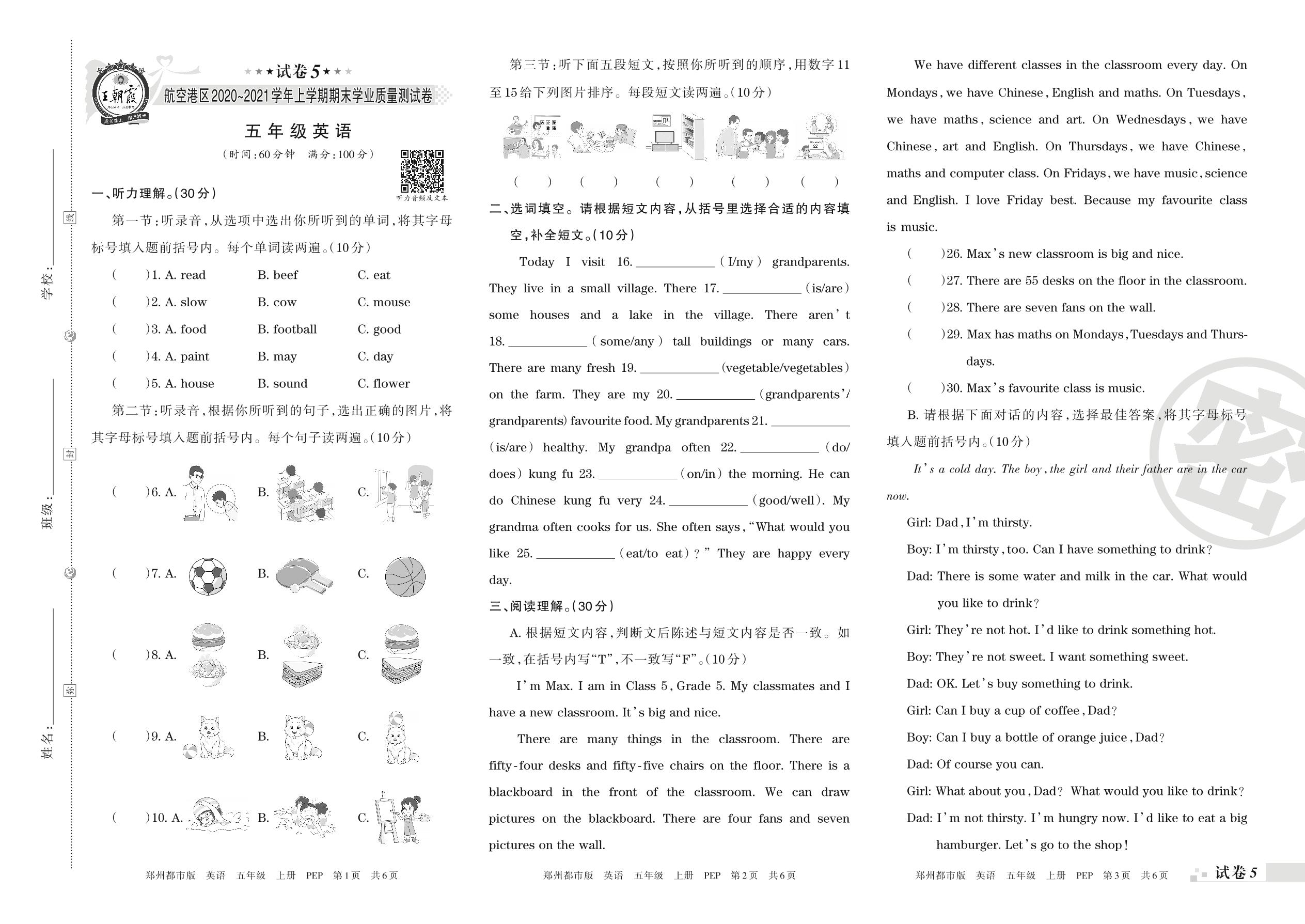 航空港区2020~2021学年上学期期末学业质量测试卷五年级英语(人教PEP版)【5】