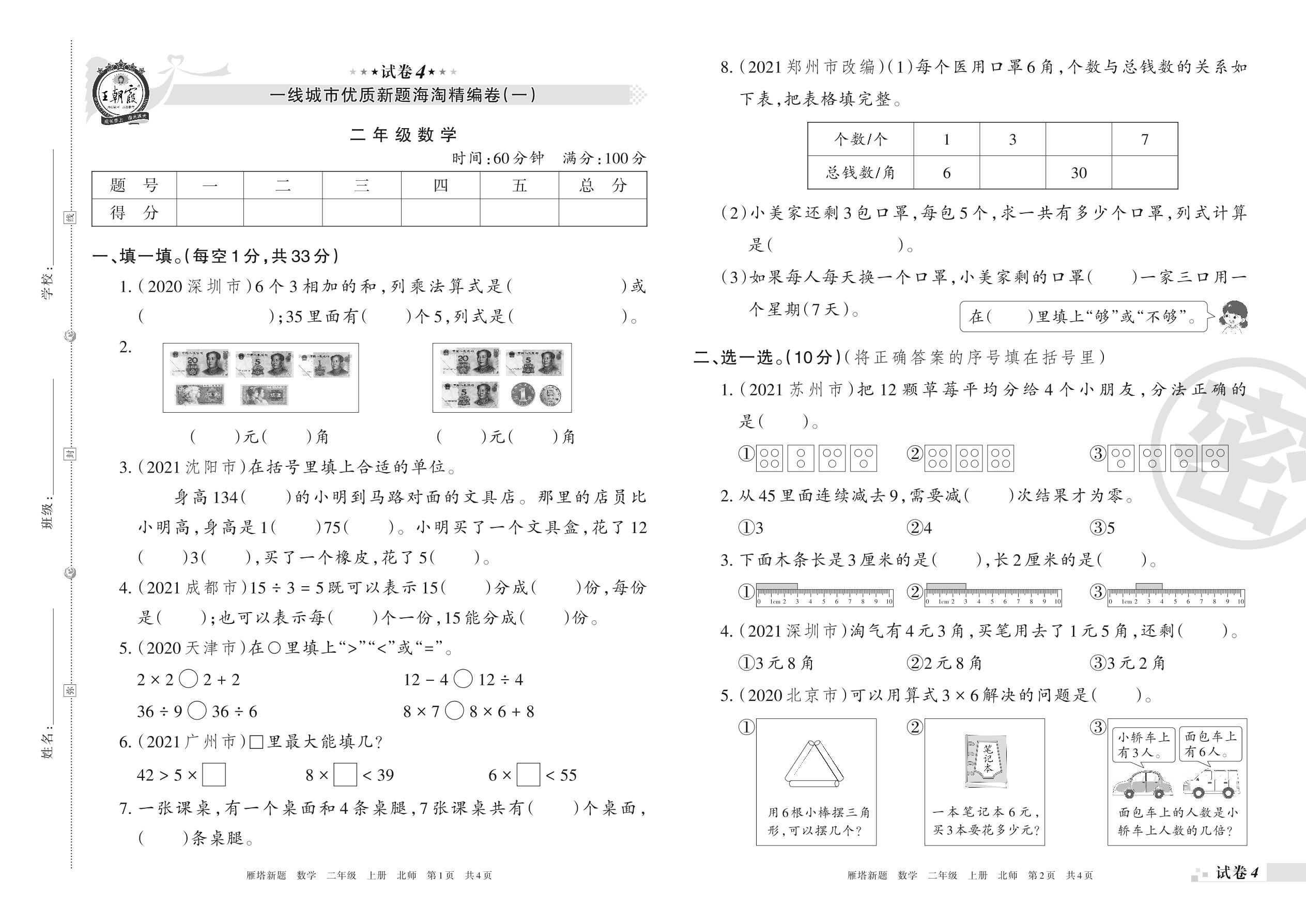 一线城市优质新题海淘精编卷(一)二年级上册数学(北师版)【4】