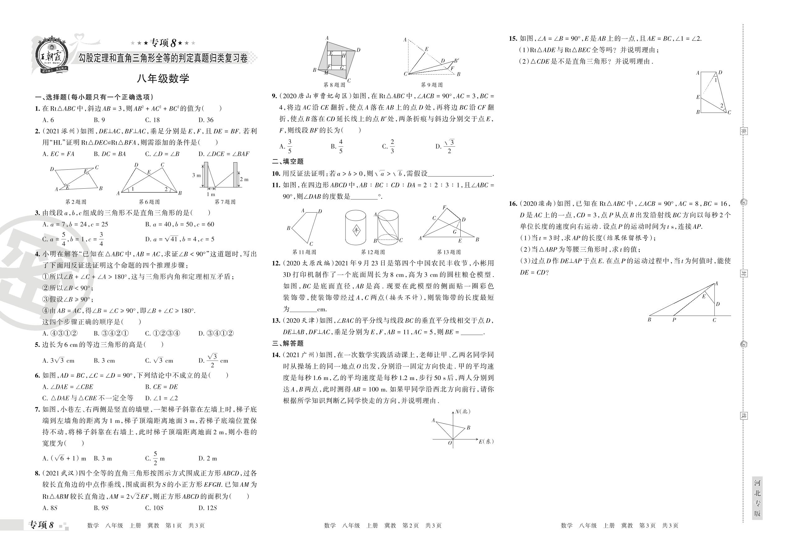 王朝霞期末专项卷——勾股定理和直角三角形全等的判定真题归类复习卷八年级上册数学(冀教版)【8】