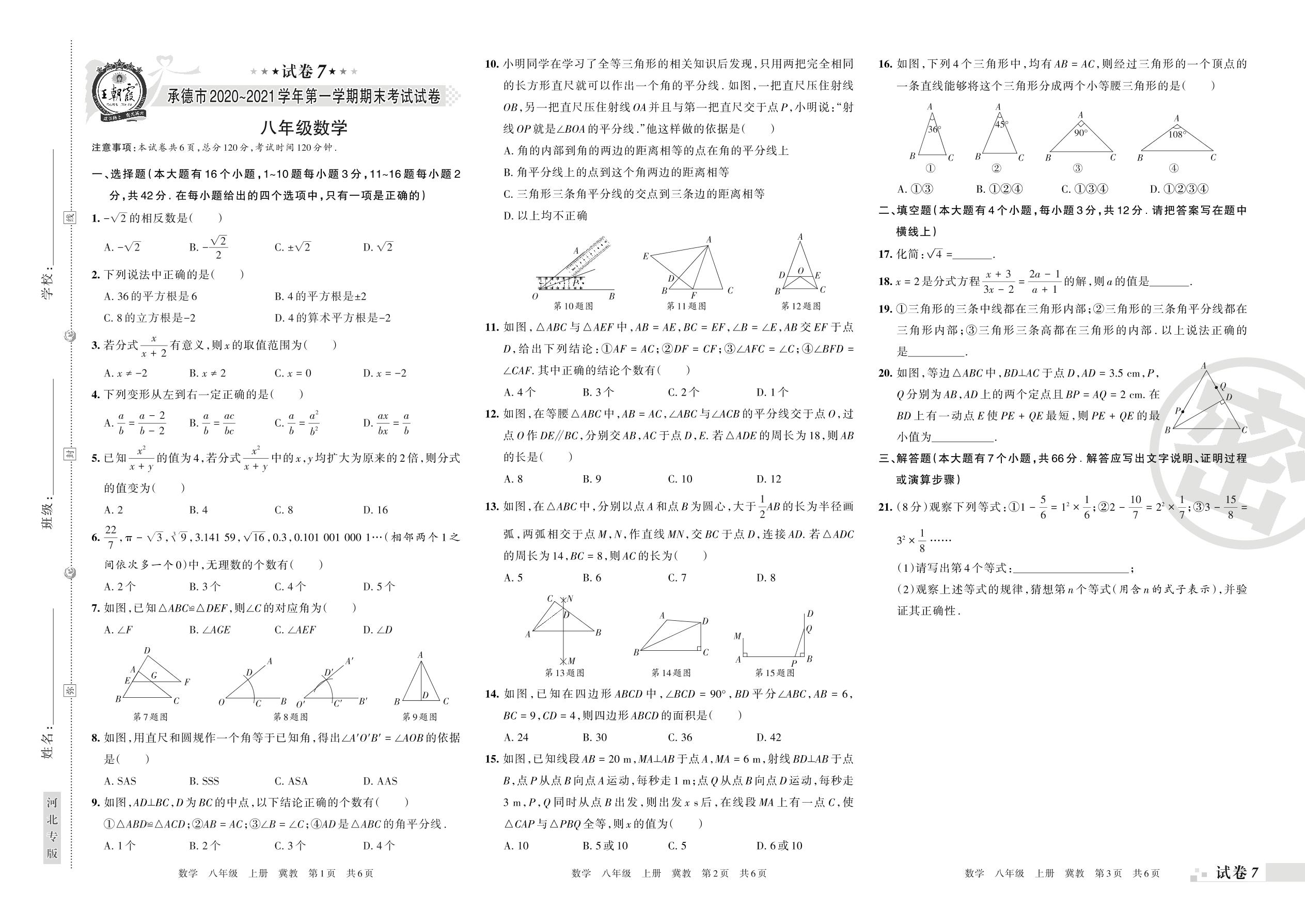 承德市2020~2021学年第一学期期末考试试卷八年级数学(冀教版)【7】