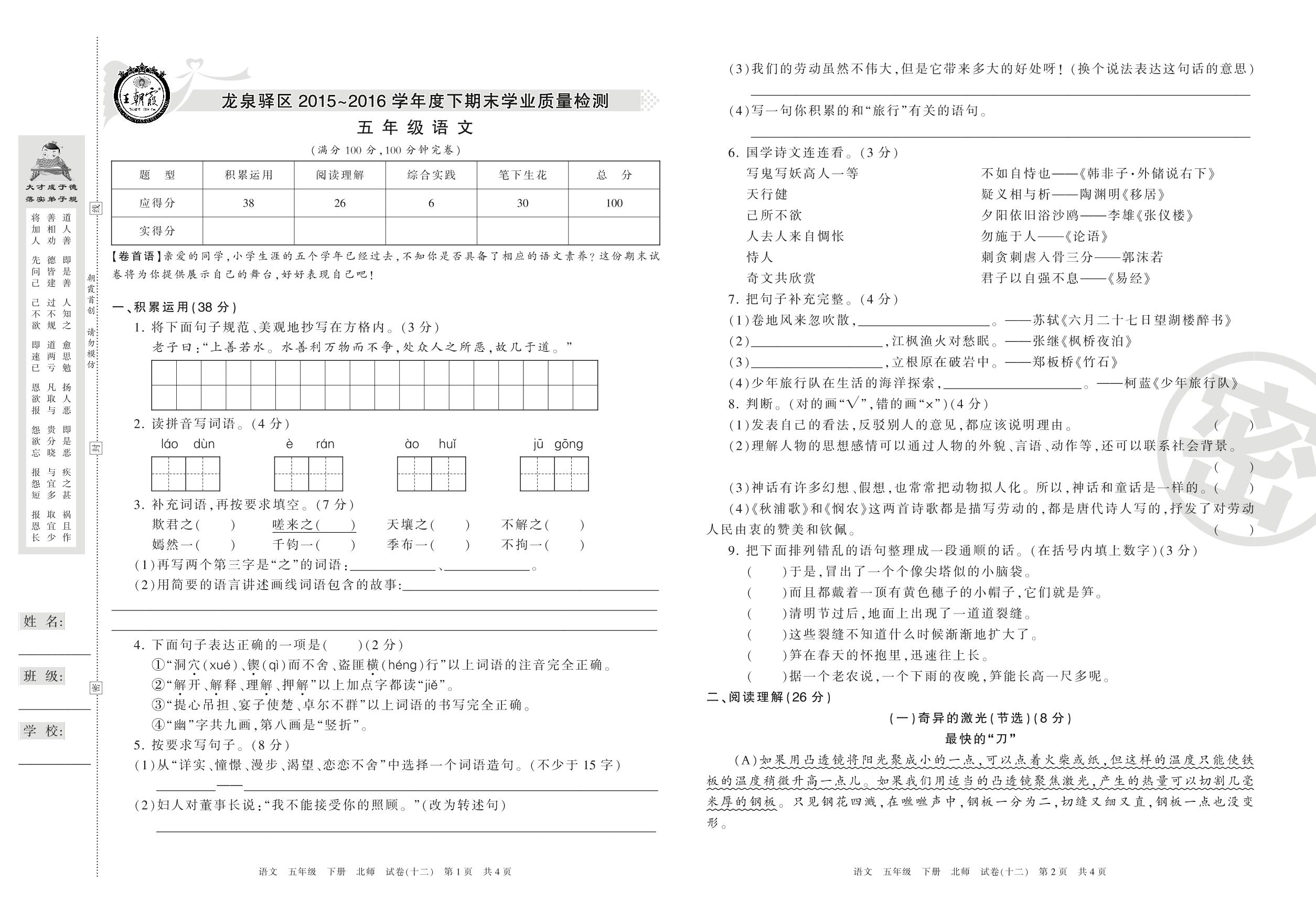 2015-2016学年第二学期成都市龙泉驿区五年级语文试卷(北师版)【12】