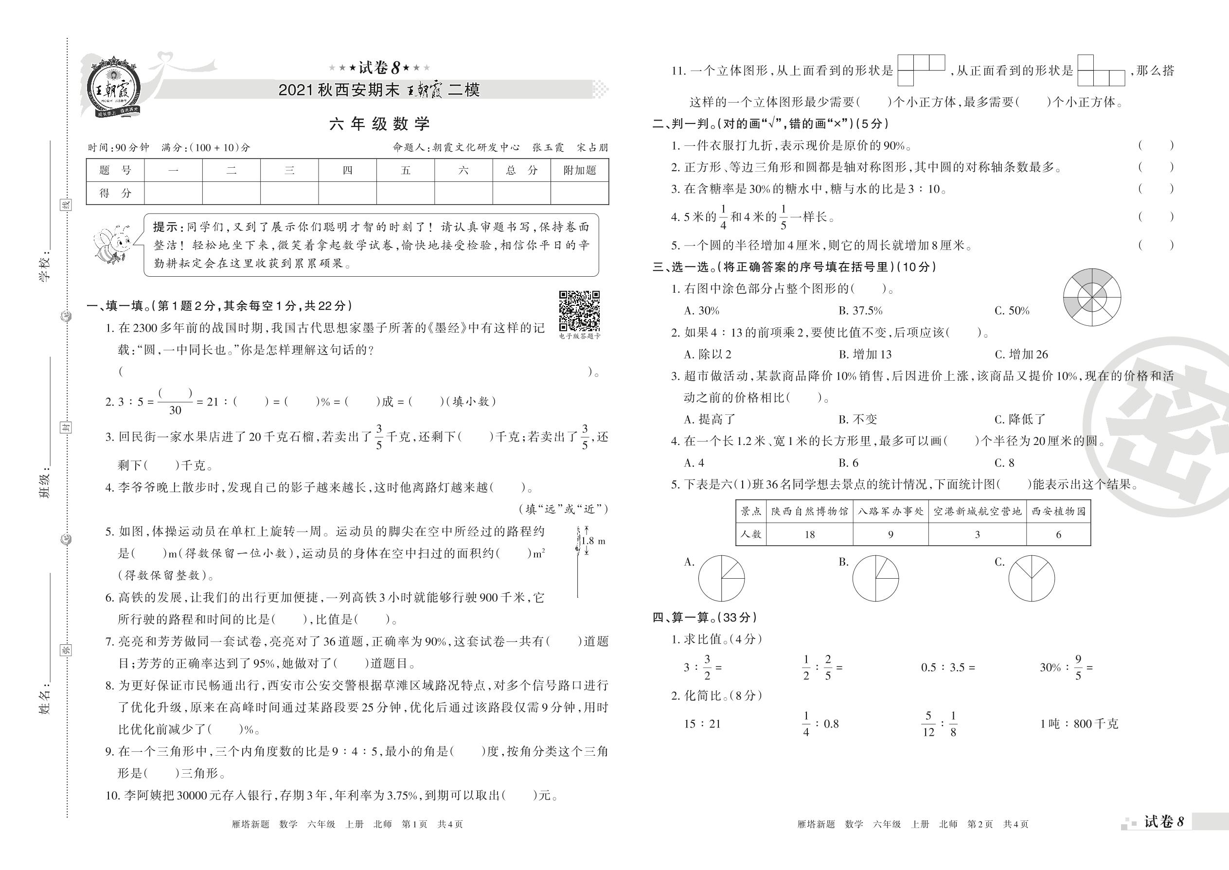 王朝霞期末模拟卷六年级上册数学(北师版)_R211223094724240【8】
