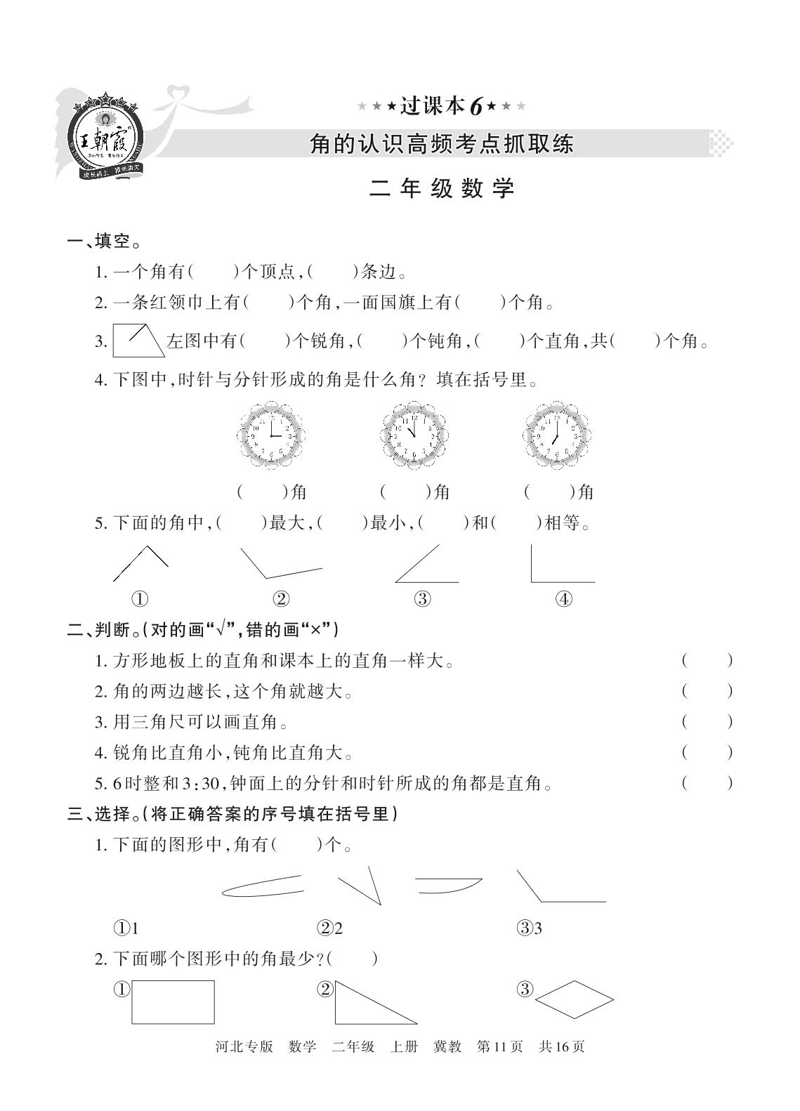 王朝霞期末过课本——角的认识高频考点抓取练二年级上册数学(冀教版)【6】