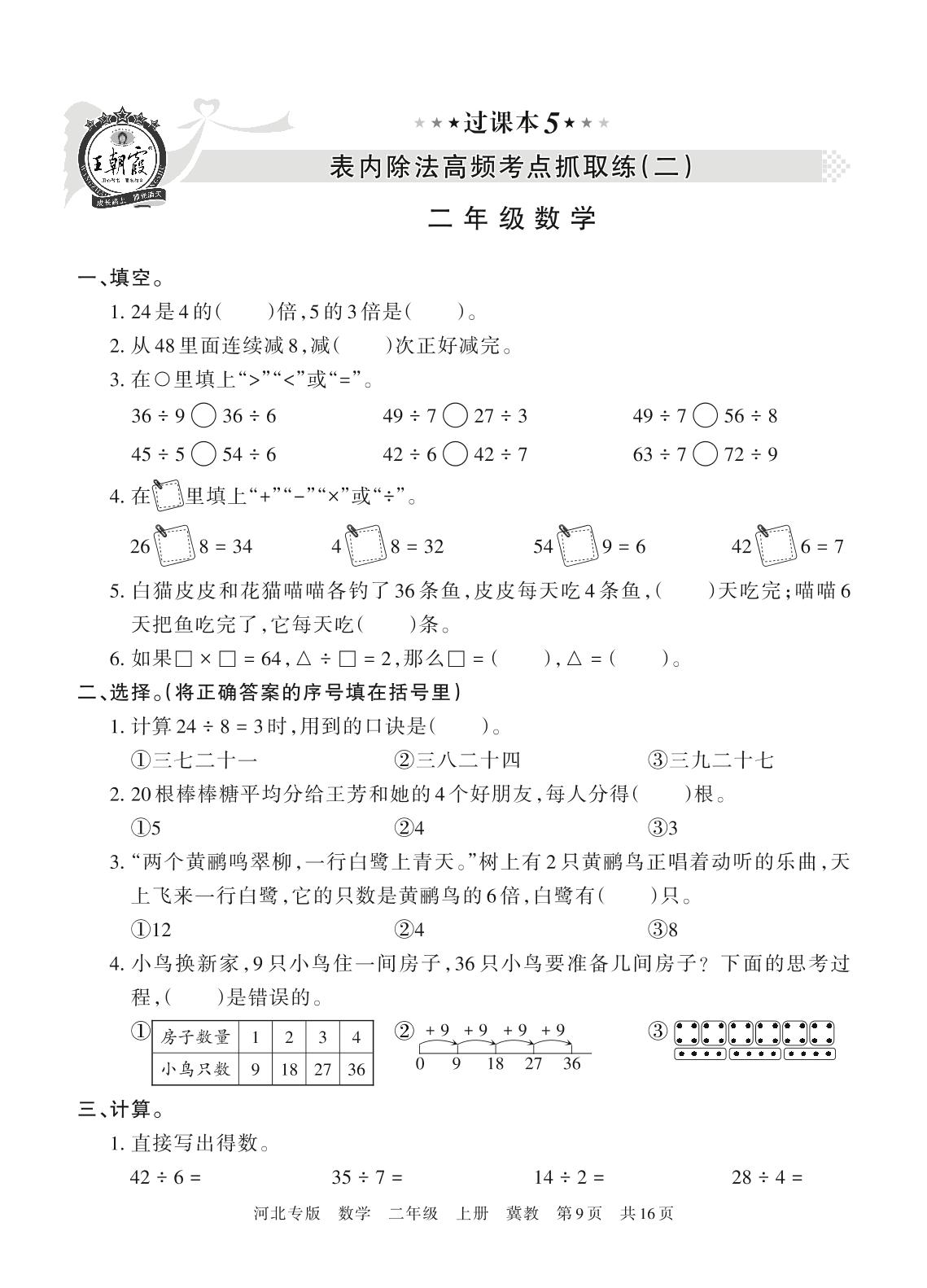 王朝霞期末过课本——表内除法高频考点抓取练(二)二年级上册数学(冀教版)【5】